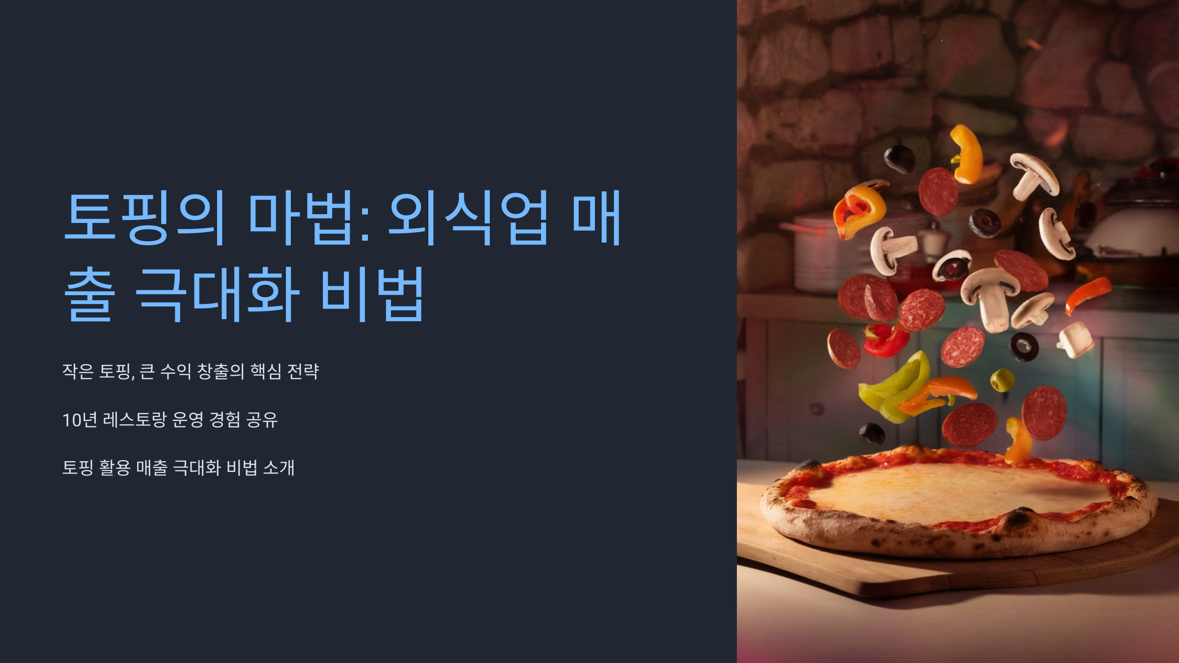토핑의 마법, 외식업 매출 극대화 비법 토핑, 작지만 강력한 수익의 원천 여러분, 피자 위의 페퍼로니 한 조각이 얼마나 큰 가치를 지닐 수 있는지 아시나요? 오늘날 외식업계에서 '토핑 경제'는 단순한 트렌드를 넘어 수익 창출의 핵심 전략으로 자리 잡았습니다. 제가 10년간 레스토랑을 운영하며 깨달은 것은, 작은 토핑 하나가 때로는 전체 메뉴의 운명을 바꿀 수 있다는 사실이었죠. 이 글에서는 토핑을 활용해 매출을 극대화하는 외식업 성공 비법을 상세히 알아보겠습니다. 함께 토핑의 마법 같은 세계로 떠나볼까요?토핑 경제의 핵심 전략 1. 토핑의 다양화: 선택의 폭을 넓히다 고객들은 자신만의 맛을 찾고 싶어 합니다. 다양한 토핑 옵션은 이런 욕구를 충족시키는 동시에 추가 수익을 창출합니다.시즌별 특별 토핑 도입..
