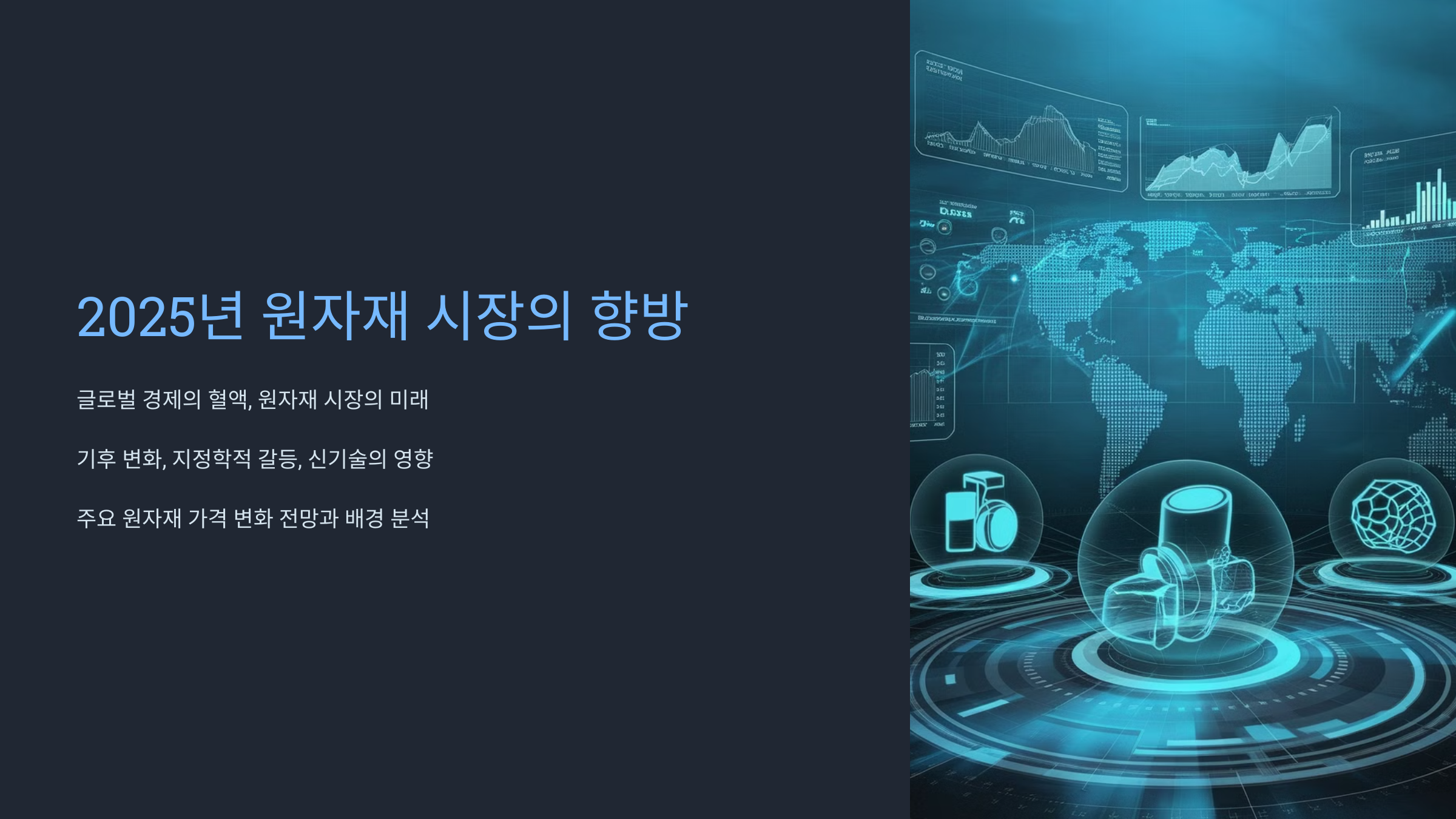2025년 원자재 시장의 향방글로벌 경제의 혈액과도 같은 원자재 시장. 2025년, 이 시장은 어떤 모습을 하고 있을까요? 기후 변화, 지정학적 갈등, 그리고 새로운 기술의 등장으로 인해 원자재 가격은 예측하기 어려운 변동을 겪고 있습니다. 이 글에서는 2025년 주요 원자재 가격의 변화 전망과 그 배경에 대해 심층적으로 살펴보겠습니다. 투자자, 기업가, 그리고 일반 소비자 모두에게 중요한 이 정보를 함께 분석해 봅시다.🌍 글로벌 경제 전망: 원자재 시장의 큰 그림경제 회복과 수요 증가코로나19 팬데믹의 여파에서 벗어나 글로벌 경제가 본격적인 회복세를 보일 것으로 예상됩니다.산업 생산 증가: 제조업 부문의 활성화로 인한 원자재 수요 상승인프라 투자 확대: 각국 정부의 경기 부양책으로 인한 건설 자재 수..