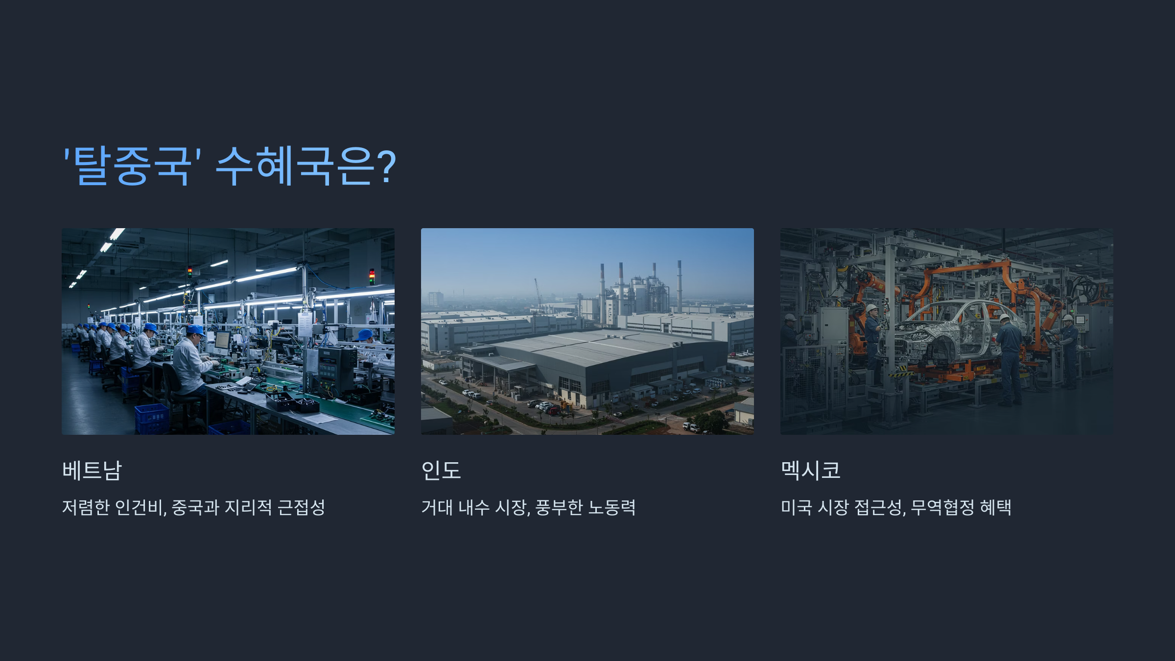 - 💰 다른 국가들의 유인책: 베트남, 인도, 멕시코 등 다른 나라들이 외국 기업 유치를 위해 세금 감면이나 규제 완화 같은 적극적인 정책을 펼치고 있어요.