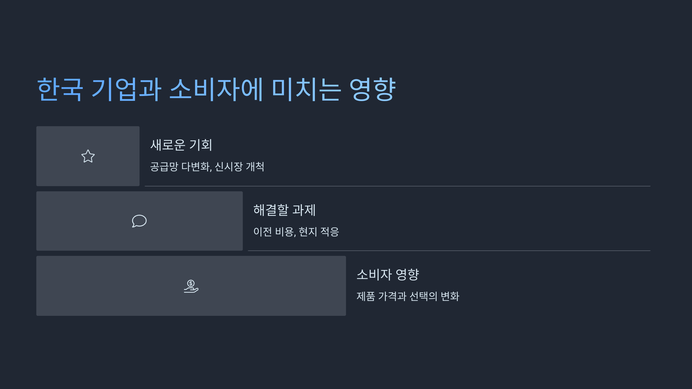 - 👍 기회: 중국에 대한 의존도를 낮추고 베트남, 인도 등 새로운 시장으로 진출하여 공급망을 다변화하고 안정성을 높일 기회가 될 수 있습니다. 또한, 일부 산업에서는 중국 기업과의 경쟁에서 유리한 위치를 점할 수도 있습니다.