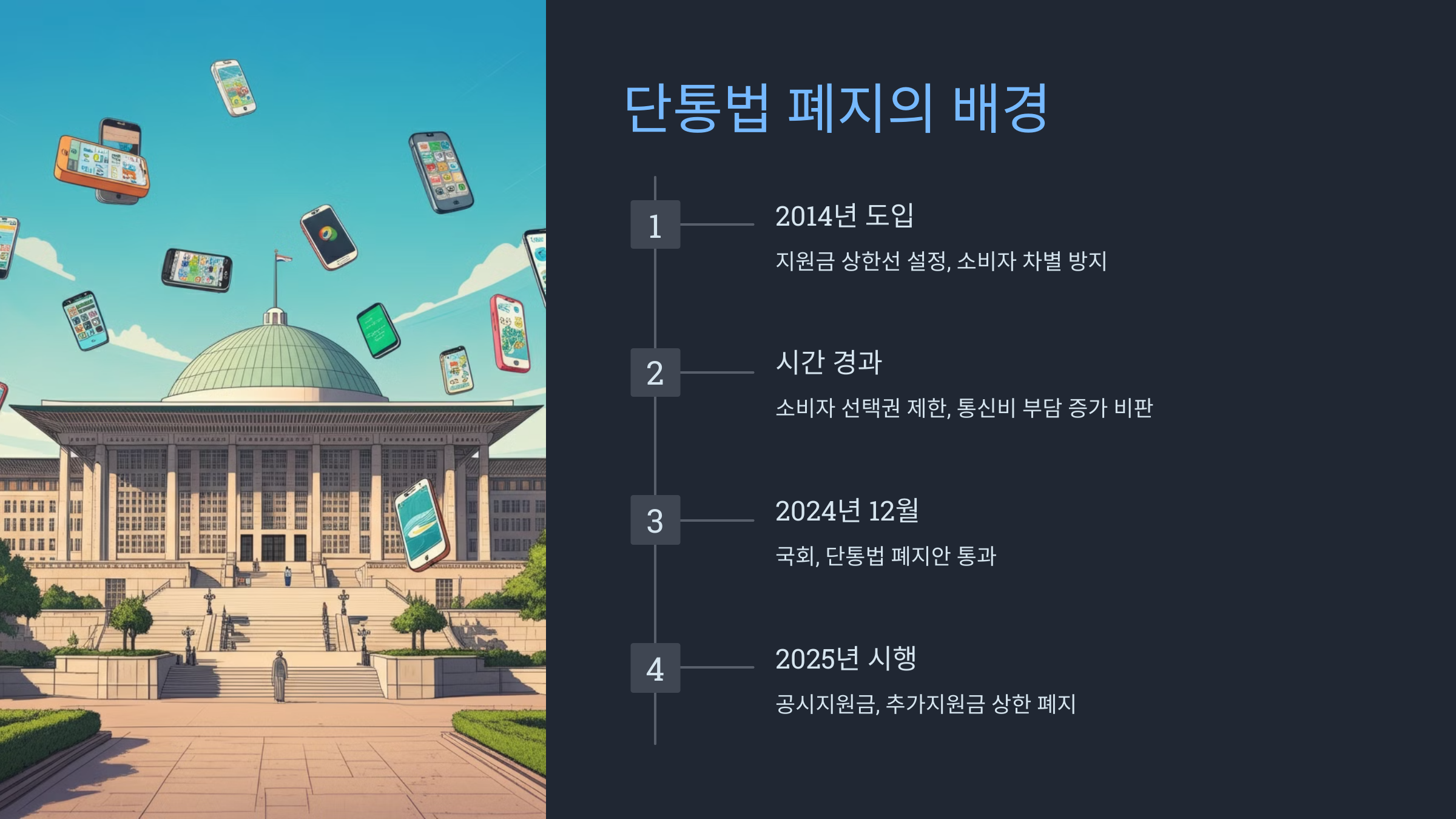 단통법은 2014년 도입되어 이동통신 단말기 지원금의 상한선을 정하고, 소비자 간 차별을 방지하기 위해 만들어졌습니다. 하지만 시간이 지나면서 오히려 소비자의 선택권을 제한하고 통신비 부담을 늘렸다는 비판을 받아왔습니다.