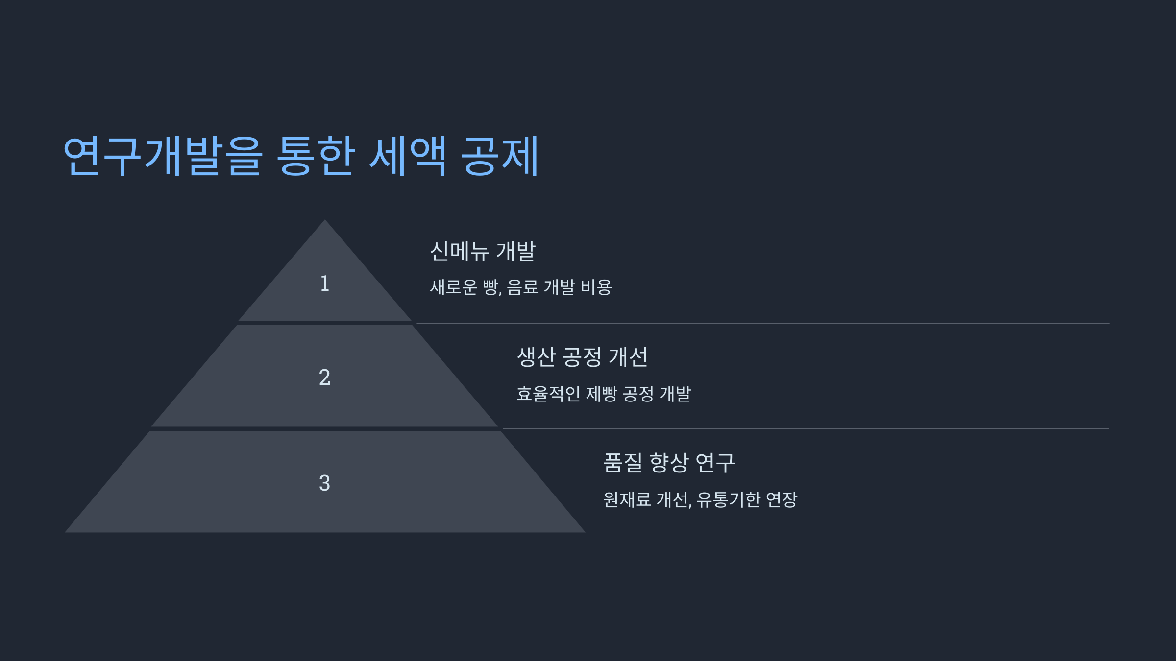 - 신메뉴 개발: 새로운 빵이나 음료 개발 비용을 연구개발비로 처리할 수 있습니다.