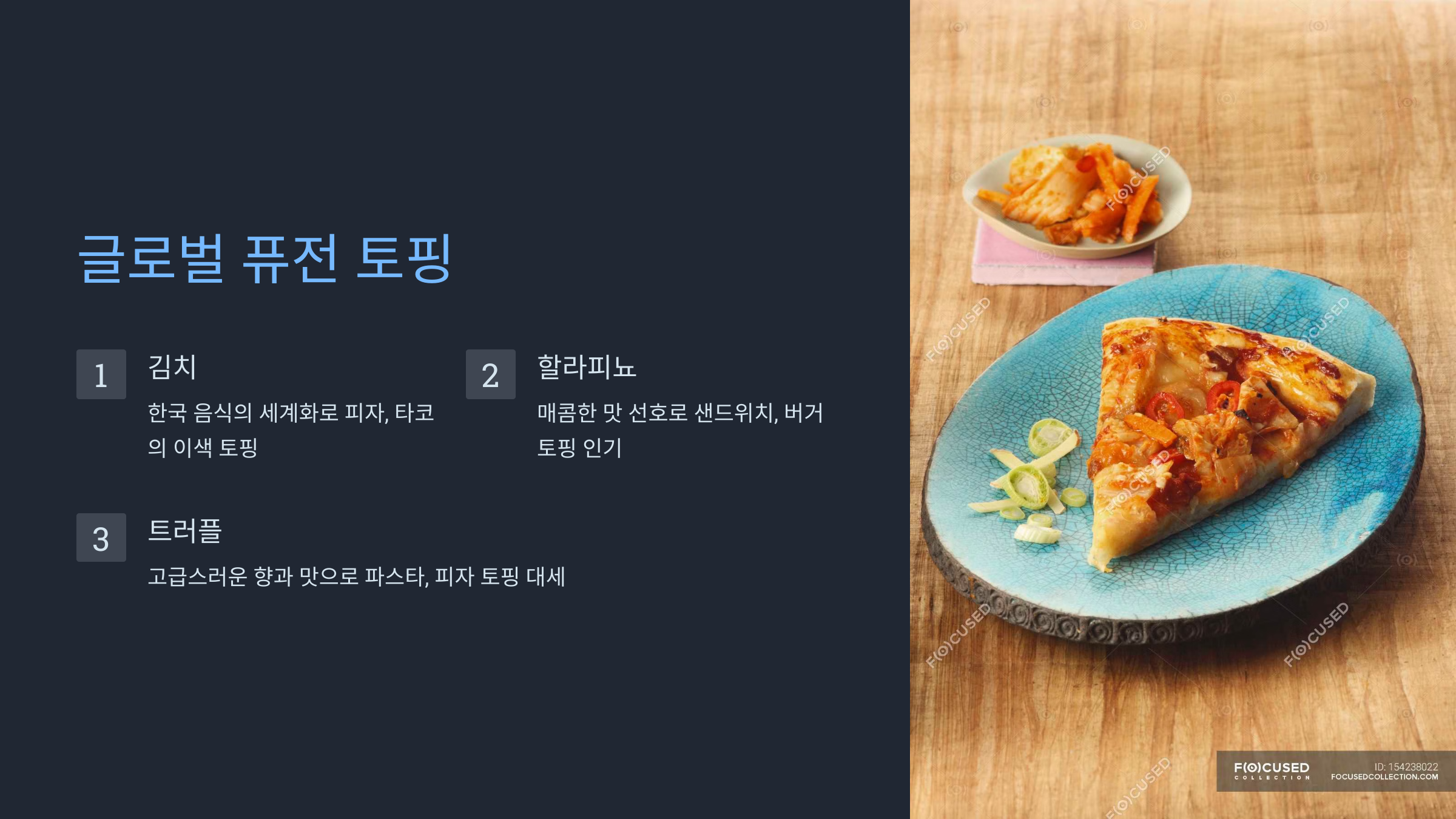 - 김치: 한국 음식의 세계화와 함께 피자, 타코의 이색 토핑으로 인기