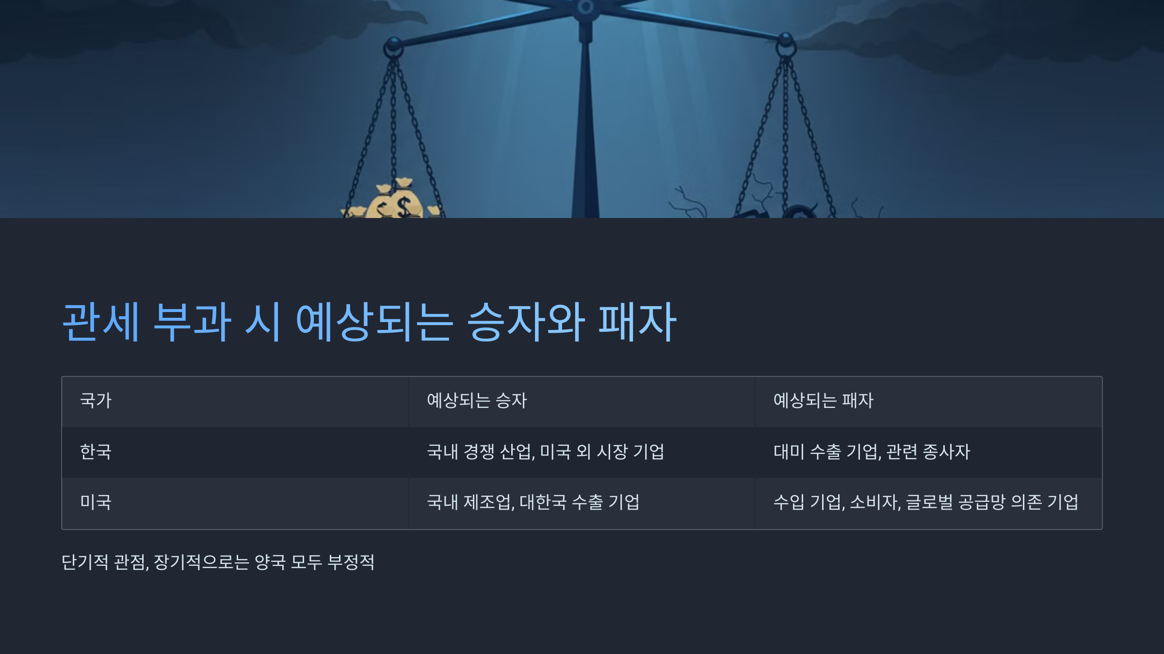 | 미국 | 일부 국내 제조업 (한국 수입 감소 효과), 미국산 제품의 대한국 수출 기업 | 한국 제품 수입 기업 및 소비자, 한국의 보복 관세 대상 산업, 글로벌 공급망에 의존하는 기업 |