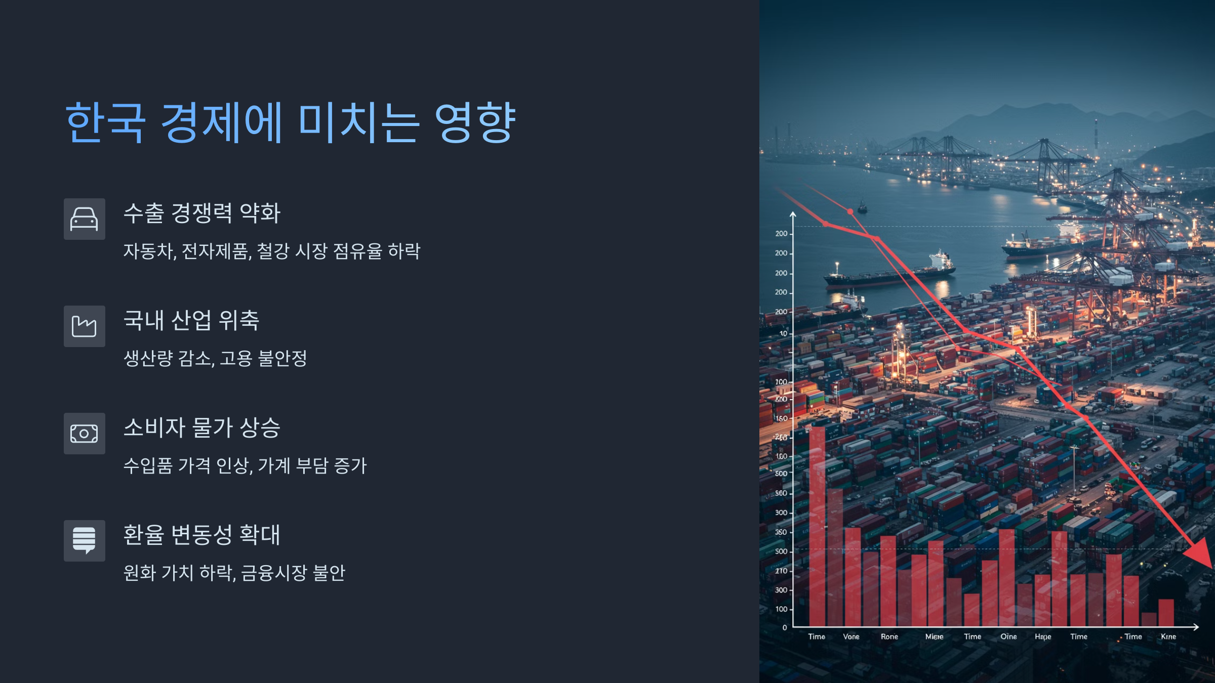 - 공급망 차질: 미국과의 무역 관계 악화는 글로벌 공급망에도 영향을 미쳐, 한국 기업들의 생산 활동에 차질을 빚을 수 있습니다.