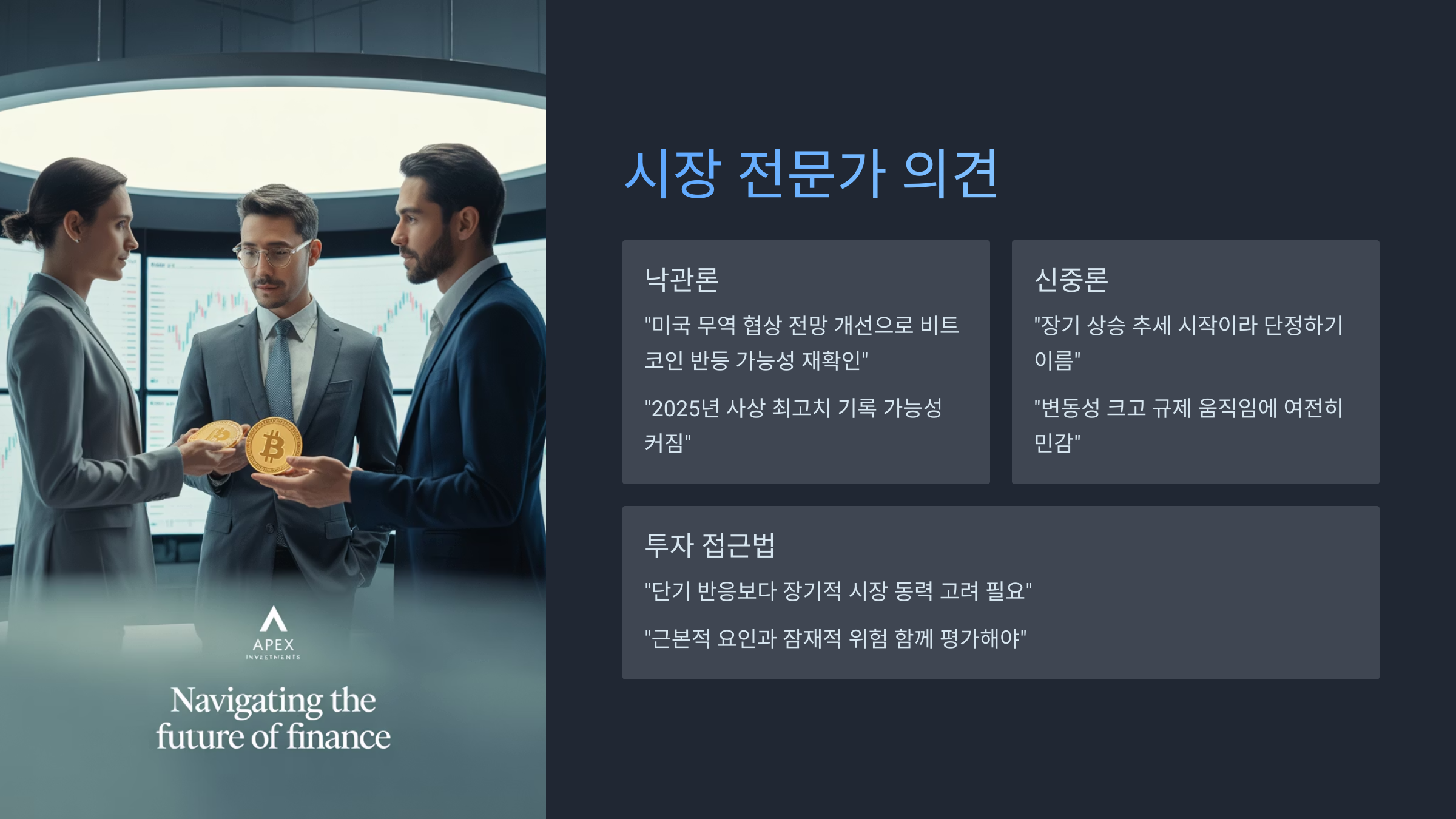 비트코인 시장은 여전히 변동성이 크고, 다양한 글로벌 규제 움직임이나 예상치 못한 거시 경제 충격에 민감하게 반응할 수 있기 때문입니다.