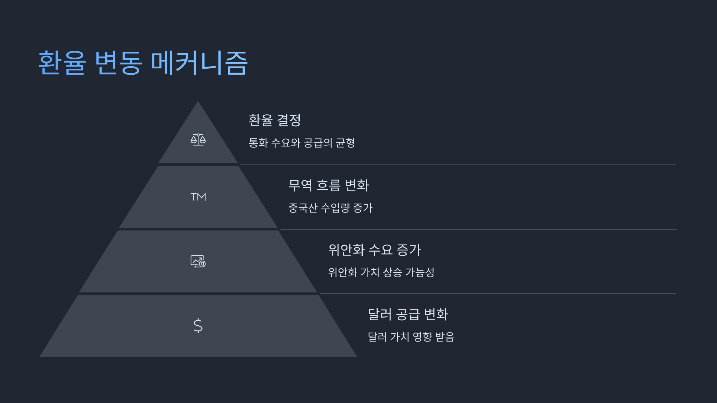 즉, 미-중 간의 무역 흐름 변화가 달러-위안 환율에 직접적인 영향을 미치게 되는 거죠.