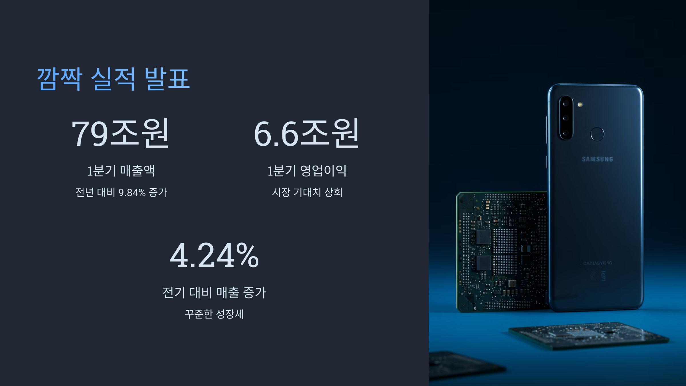 드디어 오늘(2025년 4월 8일), 삼성전자가 2025년 1분기 잠정 실적을 발표했습니다! 🎉 연결 기준으로 매출은 79조 원, 영업이익은 무려 6조 6천억 원을 기록했다고 하는데요! 이는 시장의 기대치를 훨씬 뛰어넘는 깜짝 실적(어닝 서프라이즈)이라고 할 수 있습니다. 특히, 전년 동기 대비 매출은 9.84% 증가했으며, 전기 대비로도 매출은 4.24%, 영업이익은 1.69% 증가한 수치입니다. 정말 놀라운 성과네요! 👏