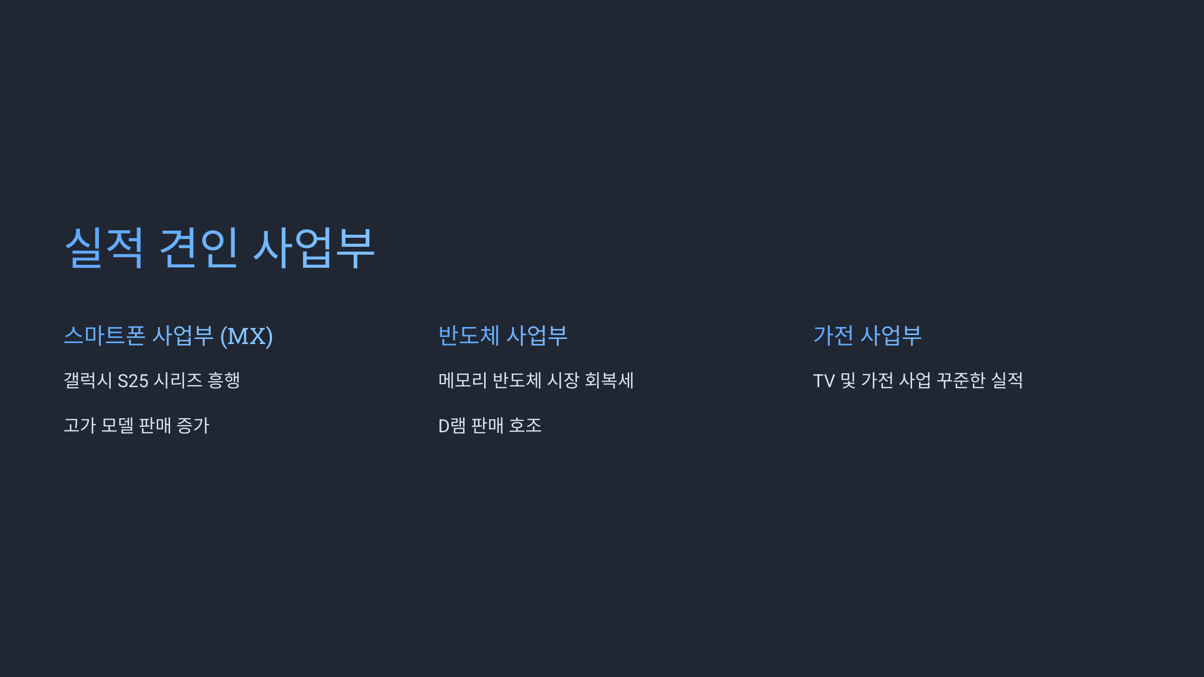 이번 삼성전자의 깜짝 실적을 이끈 주요 동력은 바로 스마트폰 사업부(MX)와 반도체 사업부인 것으로 보입니다. 특히, 갤럭시 S25 시리즈가 출시 초반부터 뜨거운 반응을 얻으며 높은 판매량을 기록한 것이 실적 개선에 큰 영향을 미친 것으로 분석됩니다. 고가 모델 판매 증가가 수익성 개선에 긍정적인 영향을 미친 것으로 보입니다.