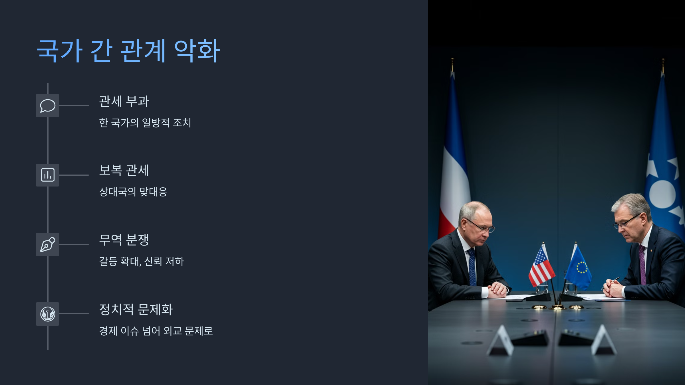 - 국가 간 관계 악화 및 무역 분쟁 심화 🤝