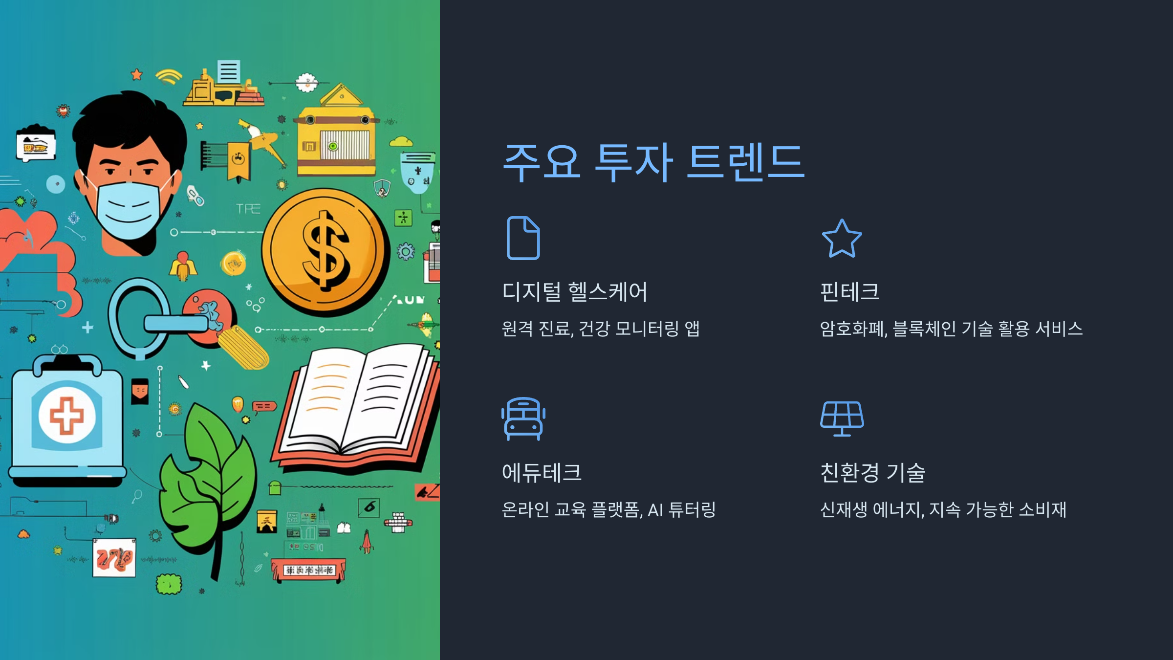 - 친환경 기술: 신재생 에너지, 지속 가능한 소비재