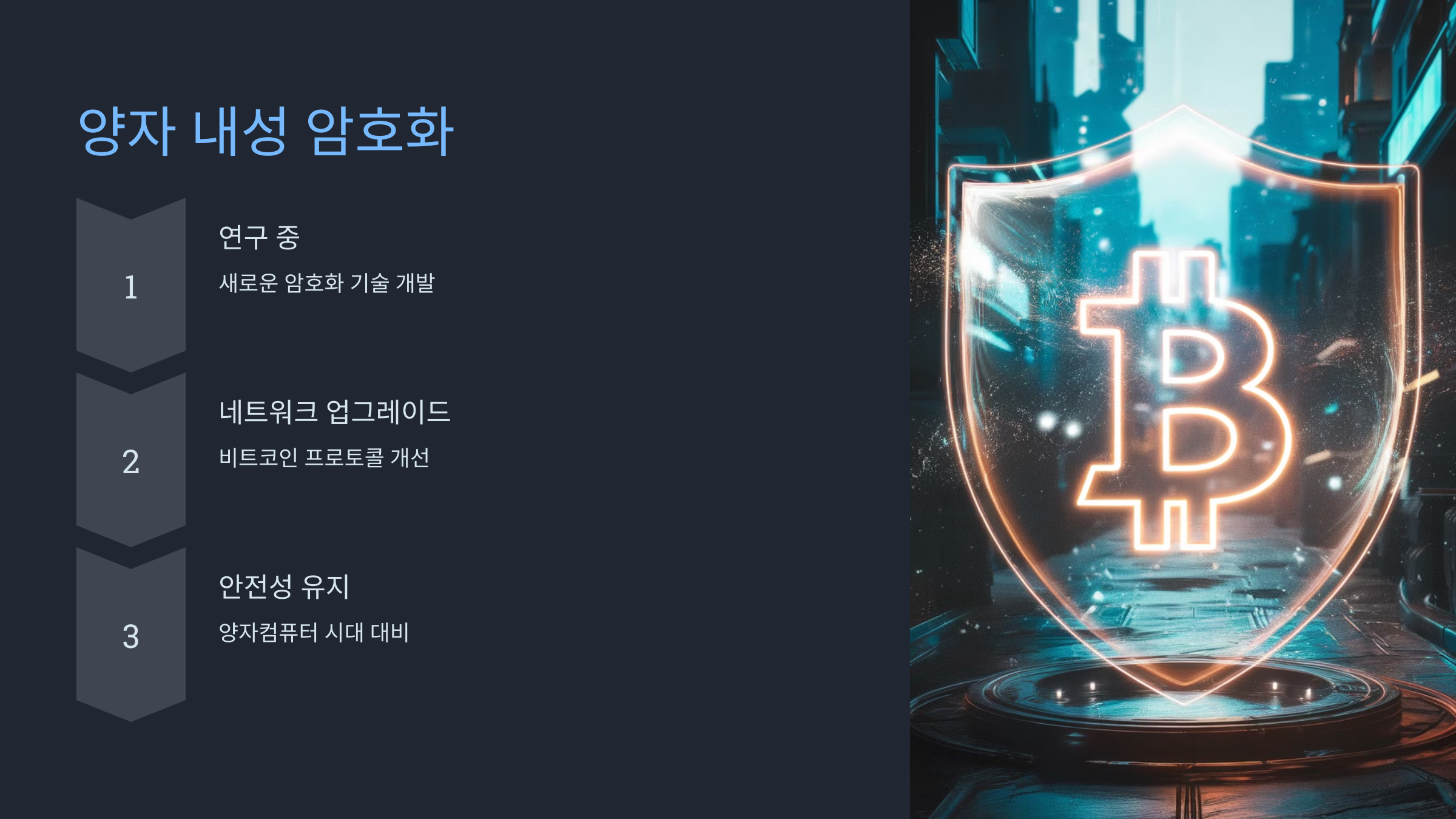 양자컴퓨터의 위협에 대응하기 위해, 암호화폐 개발자들은 '양자 내성 암호화' 기술을 연구하고 있습니다. 이는 양자컴퓨터로도 쉽게 해독할 수 없는 새로운 형태의 암호화 기술을 말합니다.