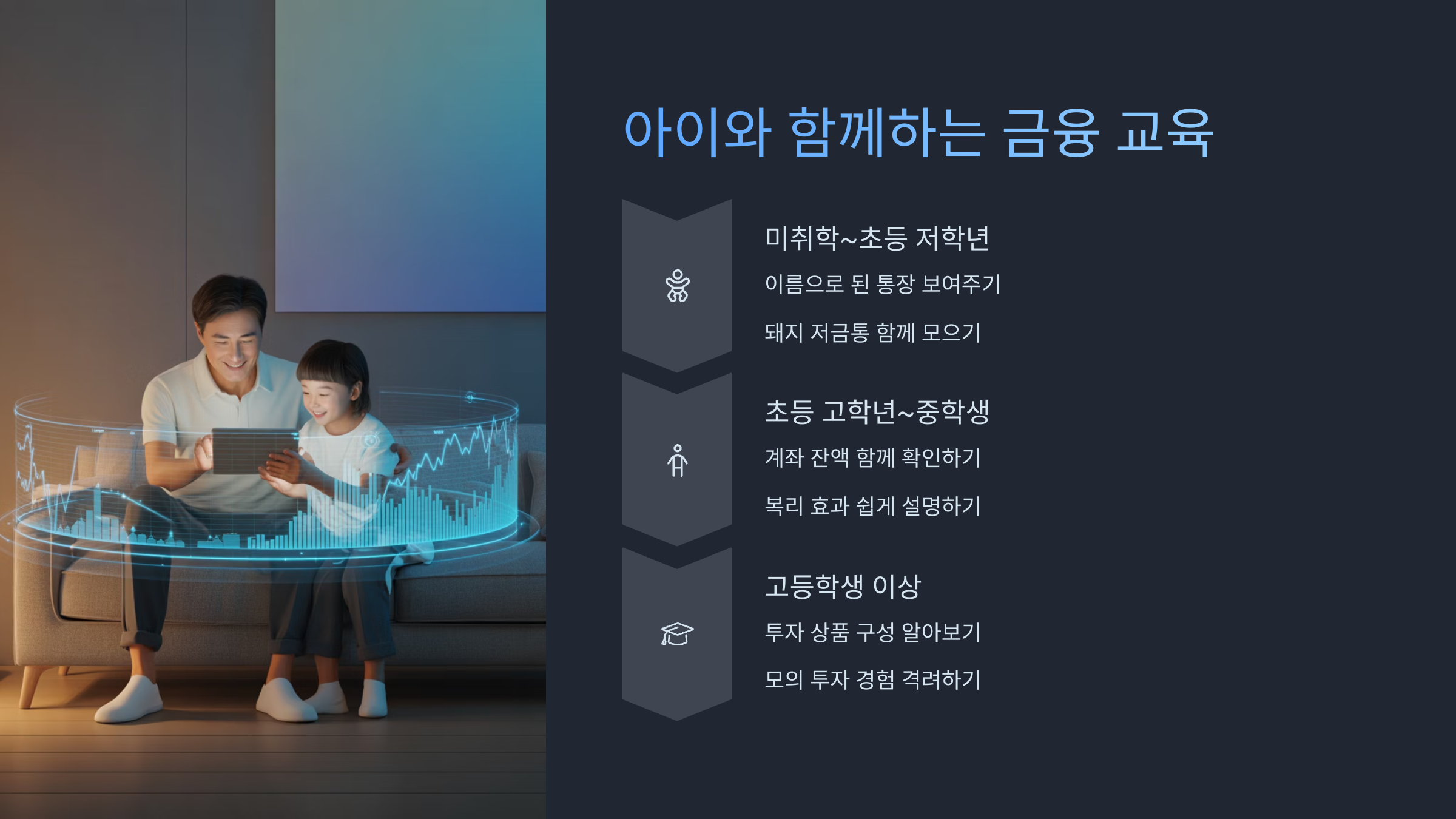- 아직 어린 아이가 투자나 경제를 이해하기 어려워하지 않을까요? 물론 처음부터 복잡한 개념을 이해하기는 어렵습니다. 하지만 아이의 눈높이에 맞춰 '용돈이 조금씩 자라나는 마법 상자', '내가 좋아하는 회사의 작은 주인이 되는 것' 등으로 쉽고 재미있게 설명해주고, 꾸준히 관심을 보여주면 자연스럽게 금융과 친숙해질 수 있습니다. 교육 효과를 너무 조급하게 기대하기보다는 긴 호흡으로 접근하는 것이 좋습니다.