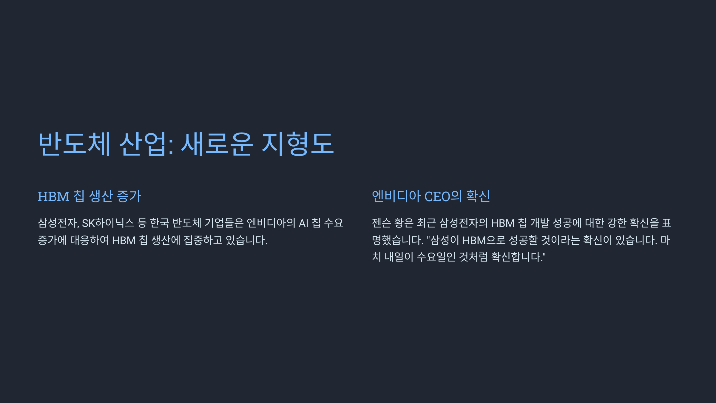 엔비디아의 영향력은 한국의 반도체 산업에 가장 직접적으로 나타나고 있습니다. 삼성전자와 SK하이닉스 같은 한국의 주요 반도체 기업들은 엔비디아의 AI 칩 수요에 대응하기 위해 생산 라인을 재편하고 있습니다. 특히 고대역폭 메모리(HBM) 칩 생산에 박차를 가하고 있죠.