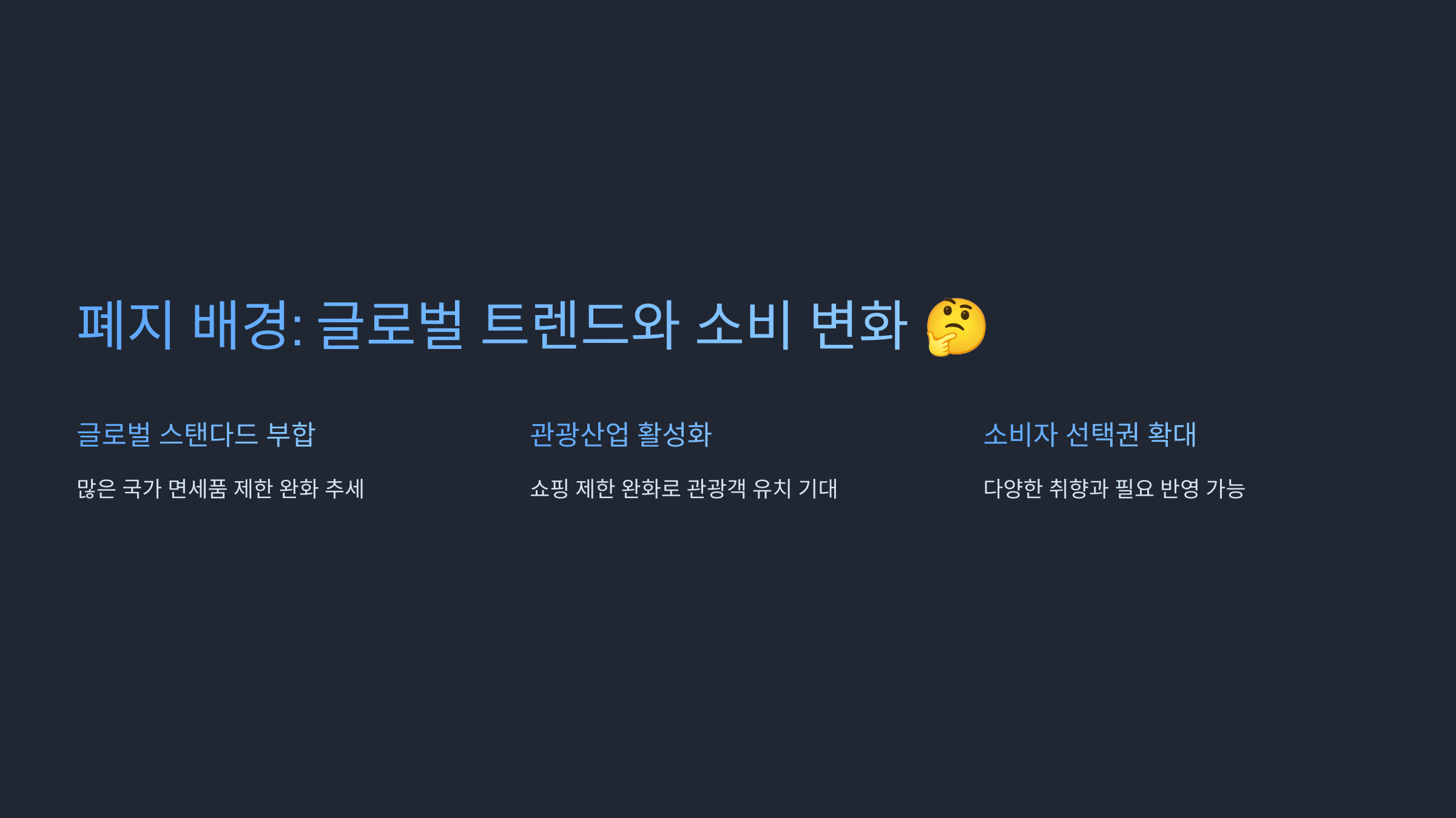 - 글로벌 스탠다드 부합: 많은 국가들이 이미 면세품 구매 제한을 완화하고 있는 추세입니다.