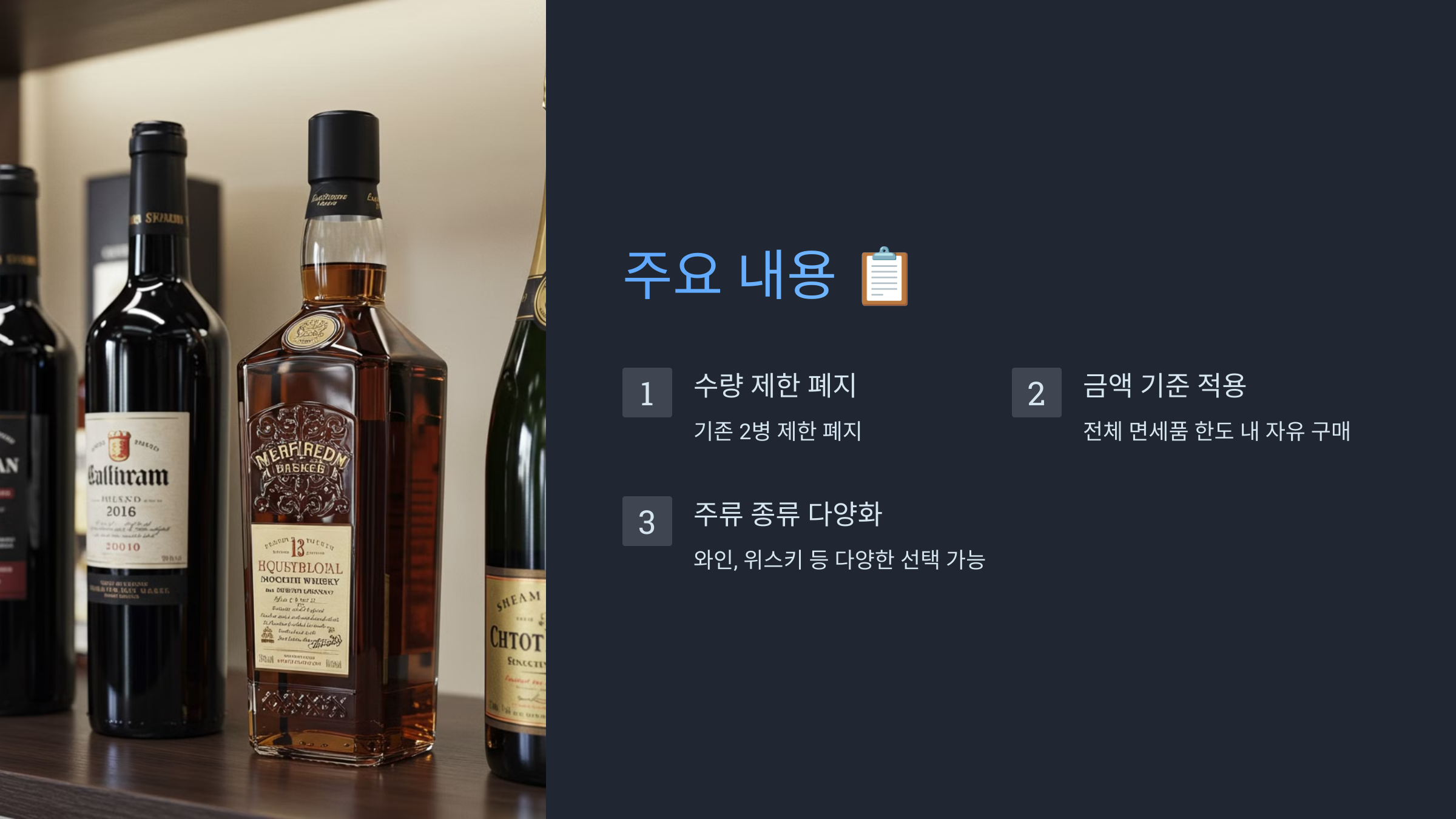 - 금액 기준 적용: 대신 전체 면세품 구매 한도 내에서 자유롭게 주류를 구매할 수 있게 됩니다.