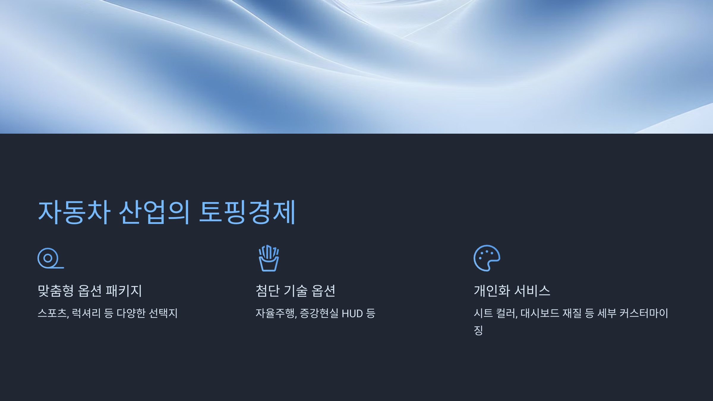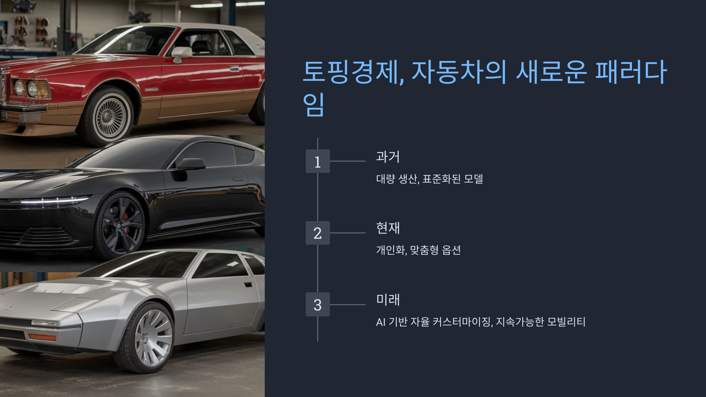 토핑경제는 자동차 산업에 혁명적인 변화를 가져왔습니다. 소비자에게는 개인화된 경험을, 기업에게는 새로운 비즈니스 기회를 제공하고 있죠. 이제 자동차는 단순한 이동수단을 넘어 개인의 취향과 라이프스타일을 반영하는 또 하나의 '공간'으로 진화하고 있습니다.