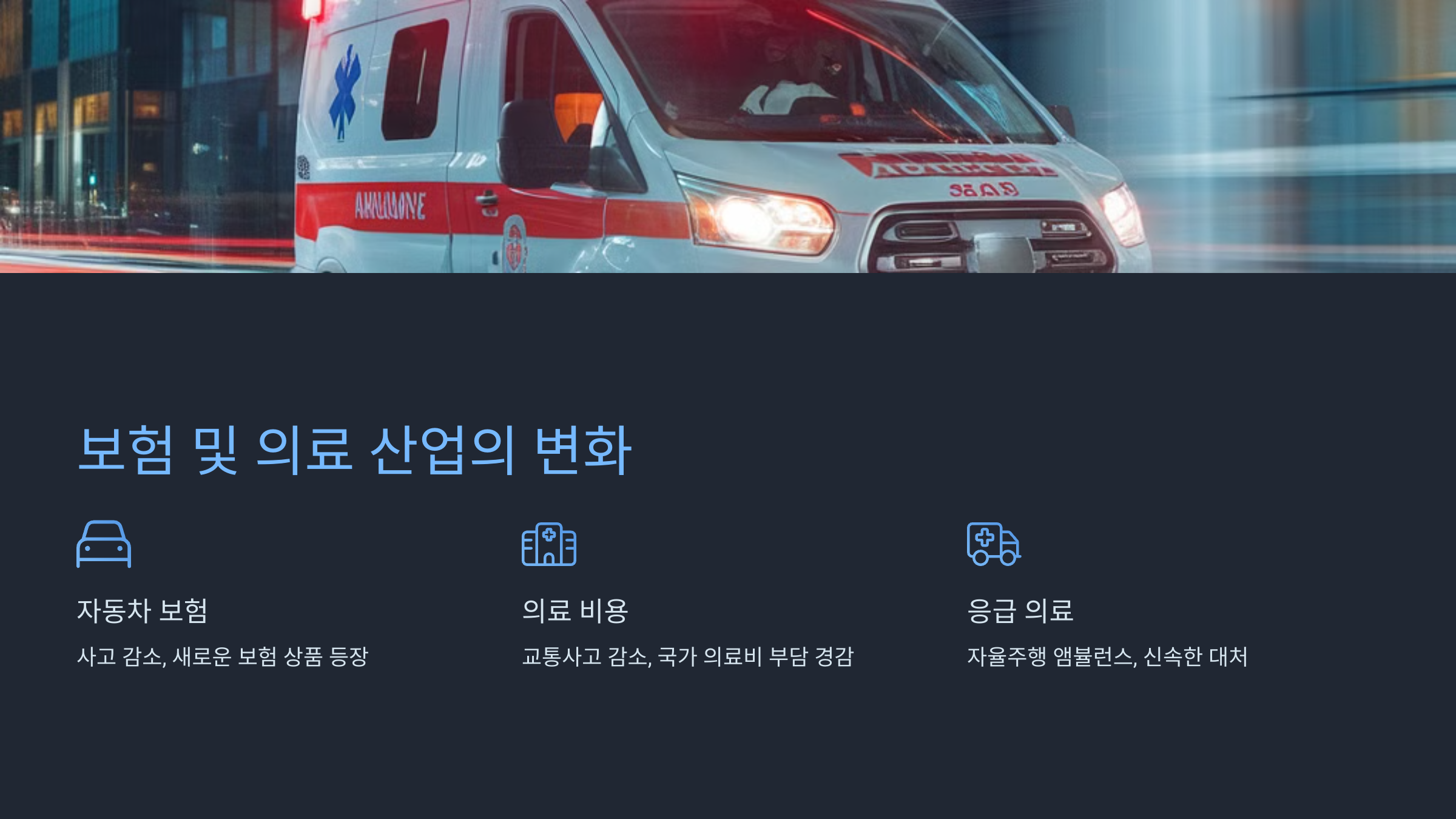 자율주행차의 도입은 보험과 의료 산업에도 큰 영향을 미칠 것입니다.