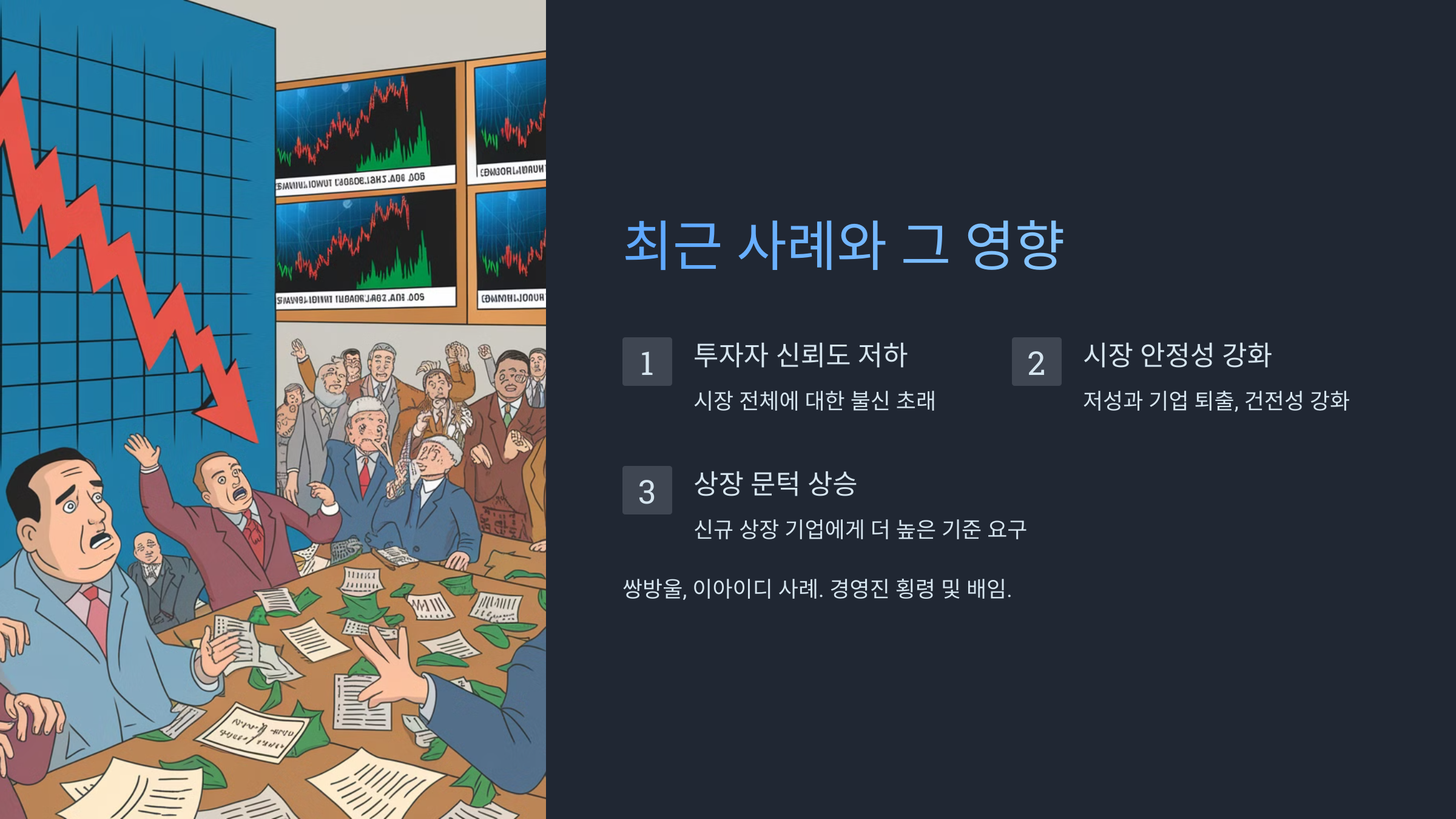 최근 쌍방울과 이아이디는 경영진의 횡령 및 배임으로 인해 상장폐지 결정을 받았습니다. 이러한 사례는 다음과 같은 영향을 미치고 있습니다: