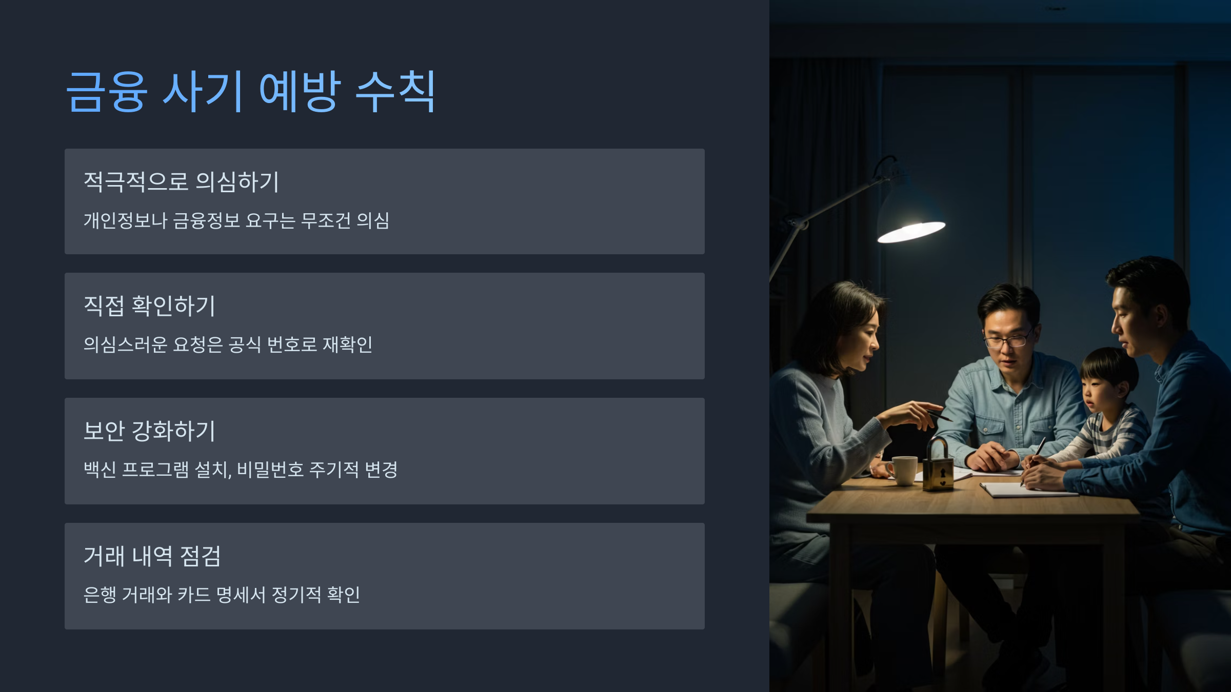 - 공식 채널 이용: 금융 거래는 해당 금융회사의 공식 홈페이지나 앱을 통해서만 이용하세요.