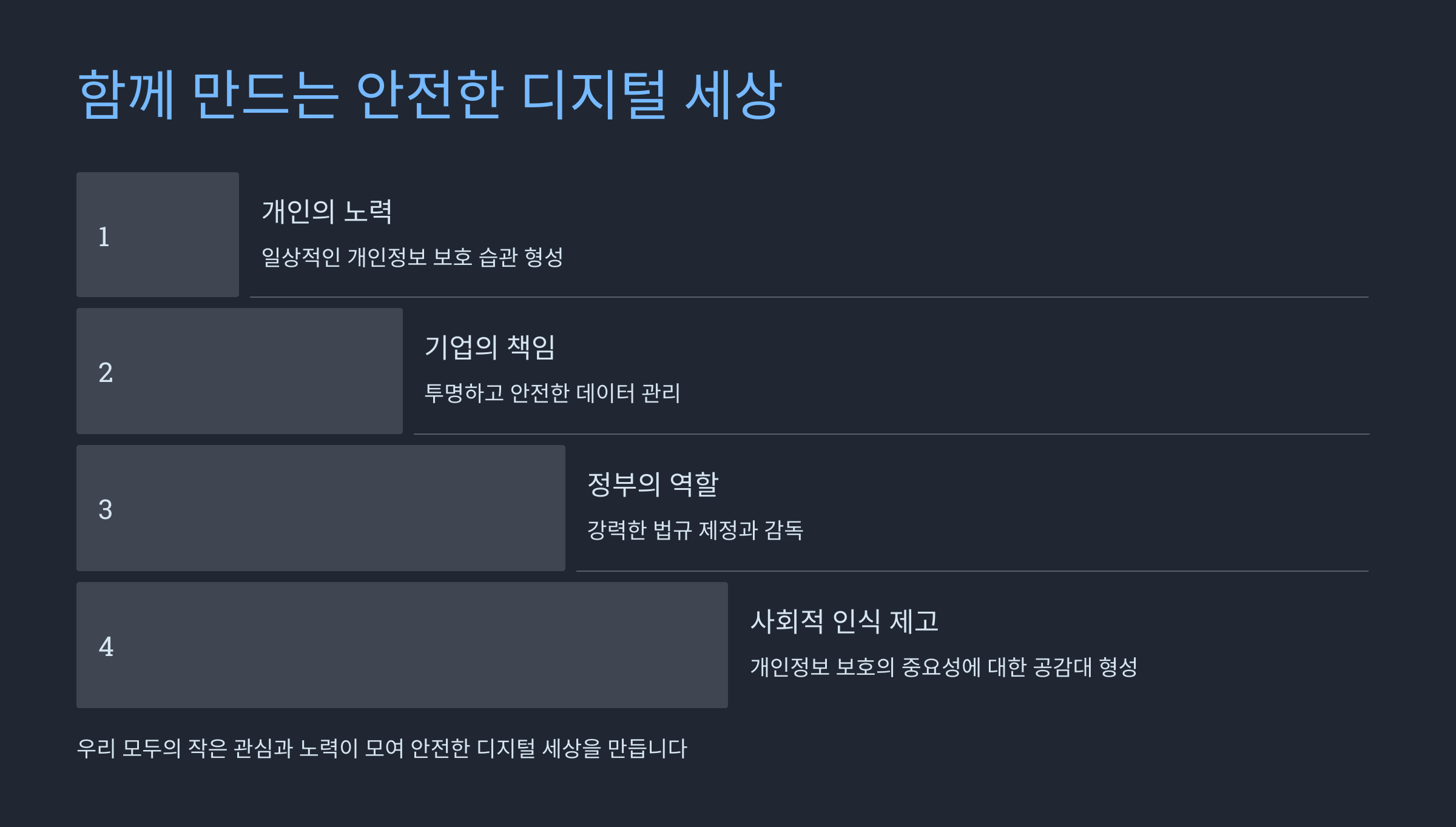 개인정보 보호는 어느 한 주체만의 책임이 아닙니다. 개인, 기업, 정부가 함께 노력해야 할 때입니다. 여러분도 오늘부터 개인정보 보호를 위한 작은 실천을 시작해보는 건 어떨까요?