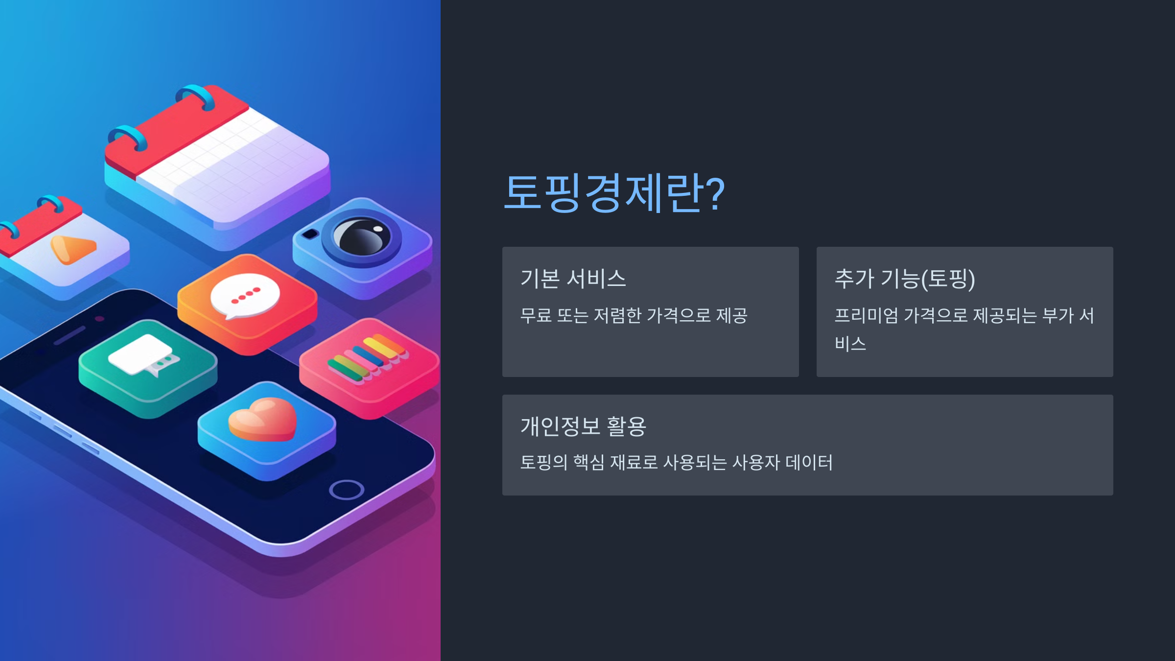 토핑경제는 기본 서비스에 추가적인 가치를 더해 수익을 창출하는 비즈니스 모델입니다. 예를 들어, 무료 앱을 다운로드 받은 후 추가 기능을 구매하는 것이 대표적이죠.