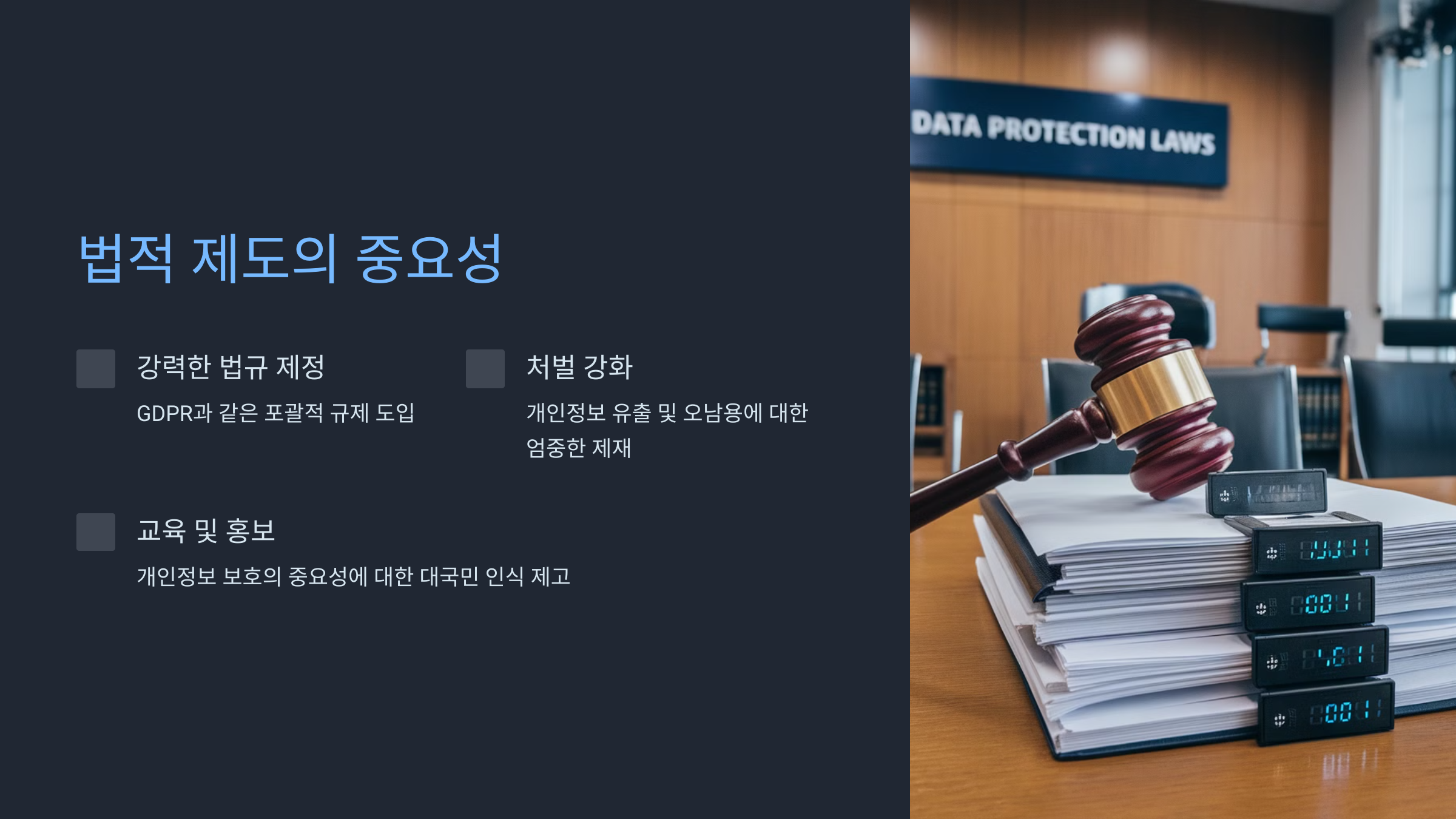 - 처벌 강화: 개인정보 유출 및 오남용에 대한 엄중한 제재