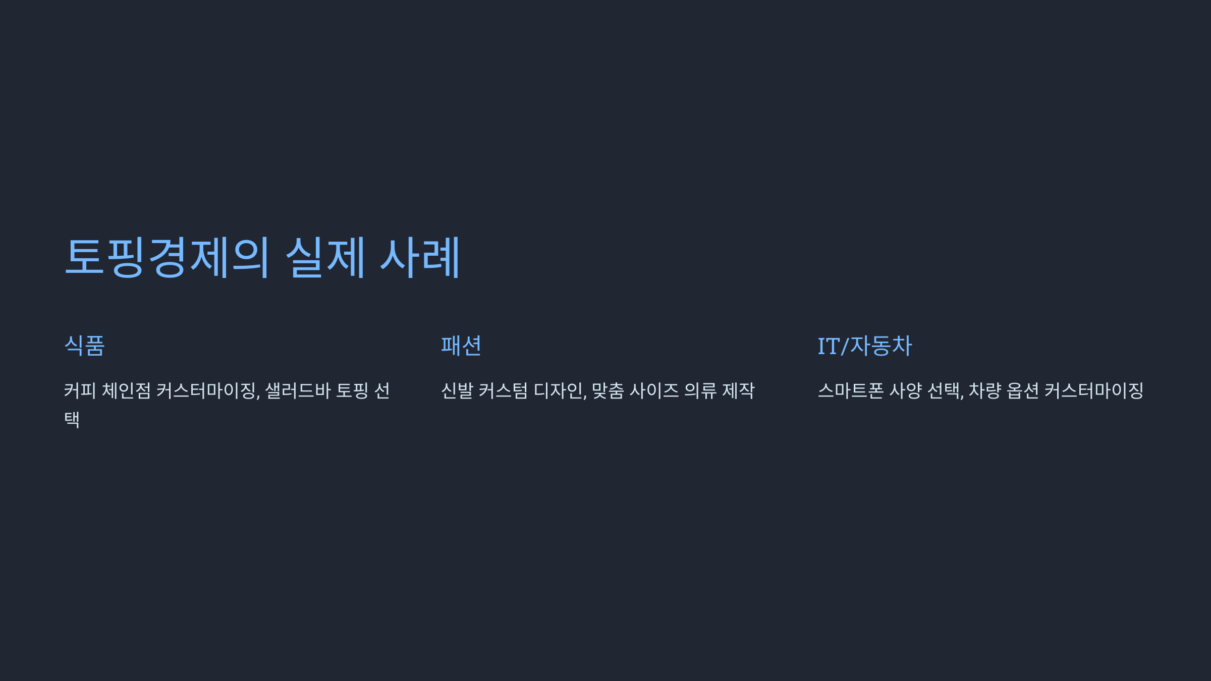 토핑경제는 이미 우리 일상 곳곳에 스며들어 있습니다. 다양한 산업 분야의 사례를 살펴볼까요?