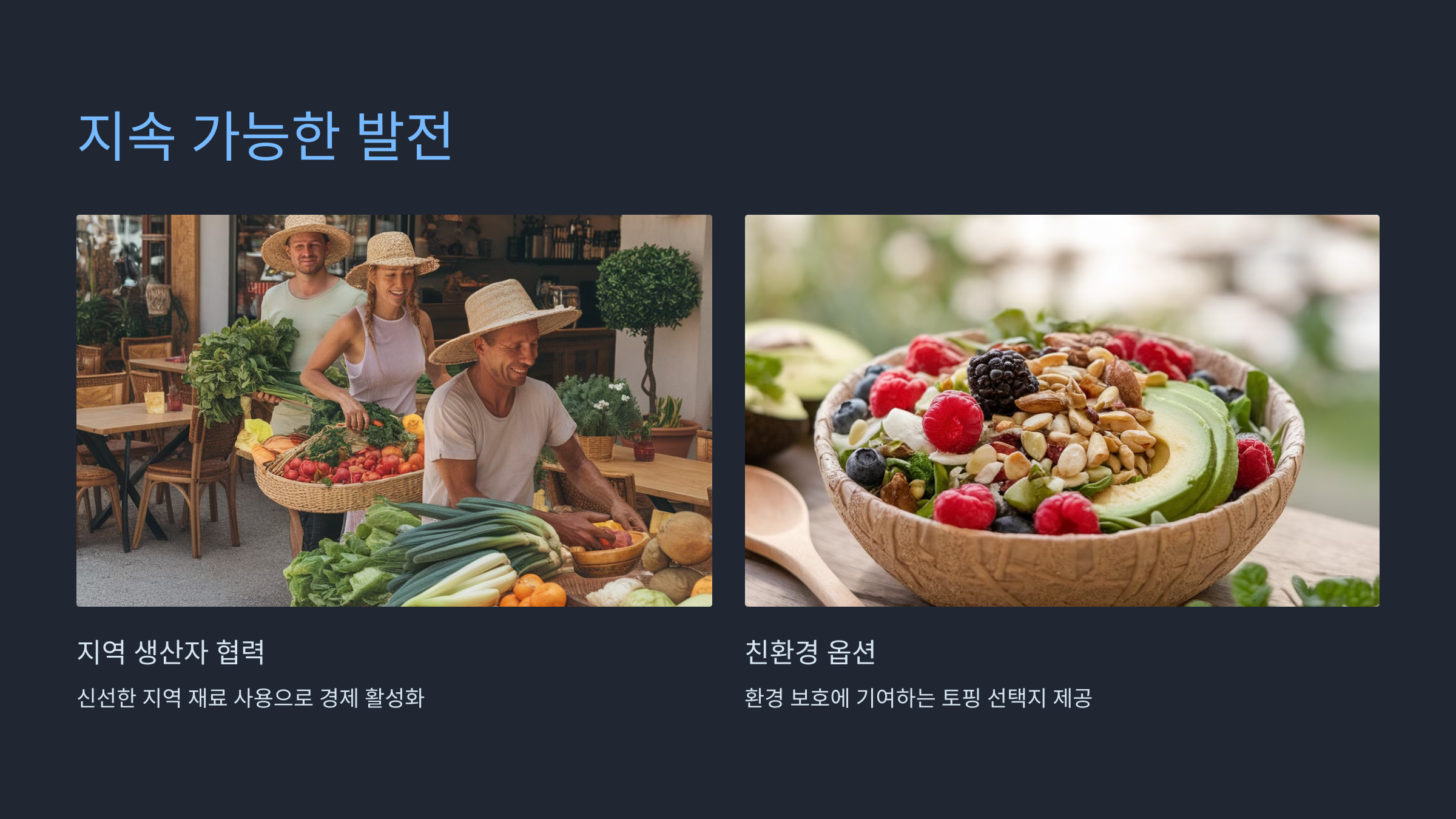 예를 들어, 지역 농산물을 활용한 신선한 토핑은 고객에게 건강한 선택지를 제공하면서 환경에도 긍정적인 영향을 미칩니다.