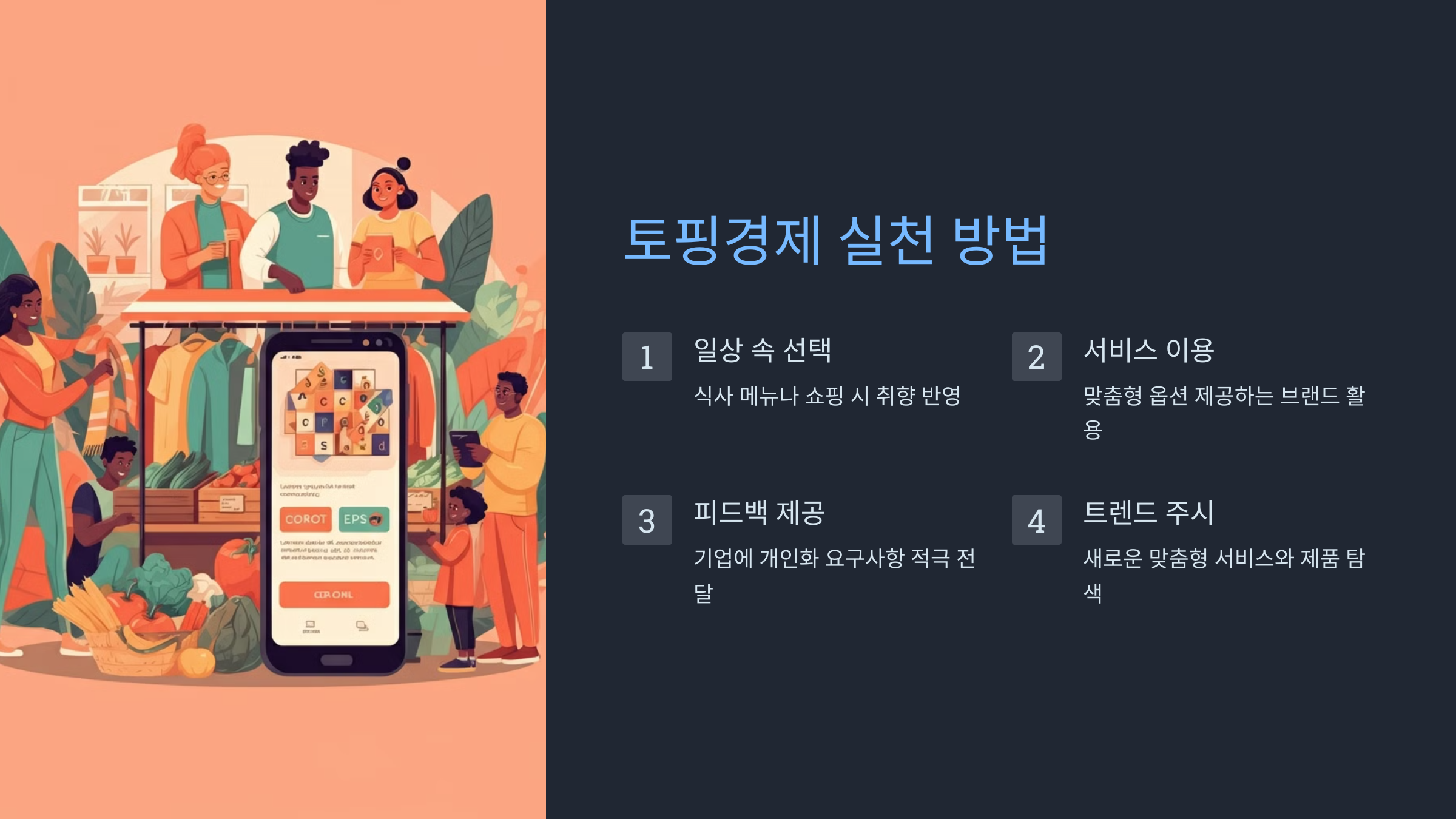 토핑경제는 기본 제품에 소비자가 원하는 추가 옵션을 선택하여 개인화된 경험을 만드는 것을 의미합니다.
