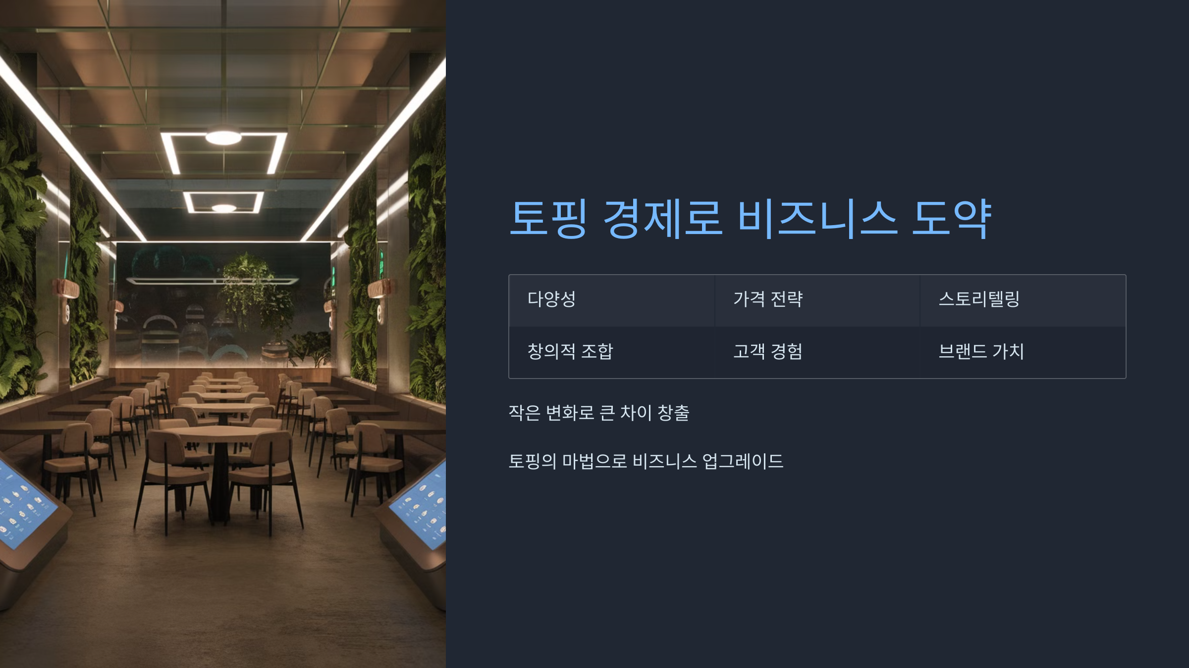 토핑 경제는 단순히 추가 수익을 넘어 고객 경험을 혁신하고 브랜드 가치를 높이는 강력한 도구입니다. 다양성, 적절한 가격 전략, 스토리텔링, 그리고 창의적인 조합을 통해 여러분의 비즈니스는 새로운 차원으로 도약할 수 있습니다.
