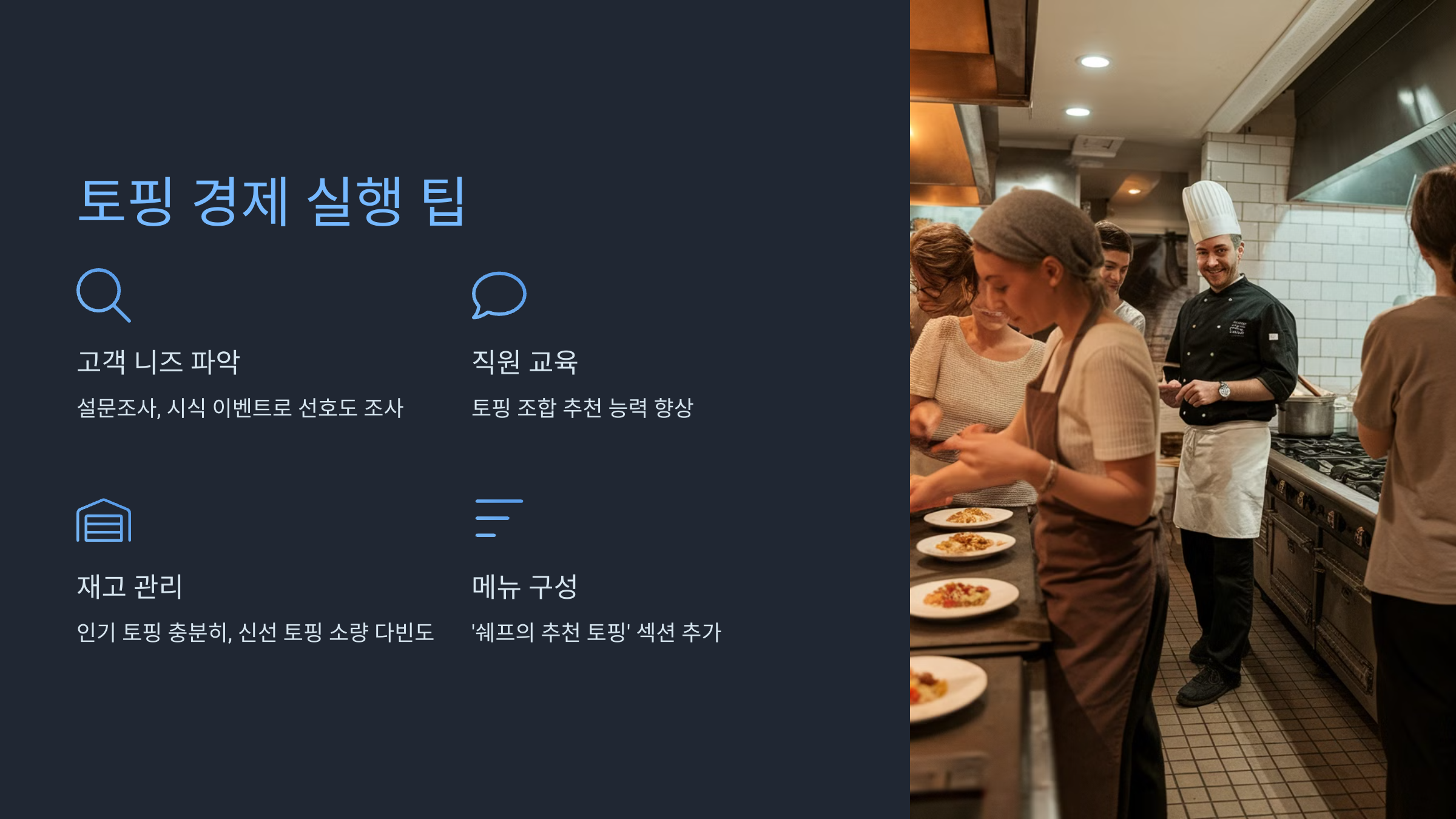 A: 대부분의 메뉴에 적용 가능하지만, 전통적인 요리나 이미 완성도가 높은 메뉴의 경우 신중한 접근이 필요합니다. 이런 경우, 사이드 메뉴로 토핑을 제공하는 방법을 고려해보세요. - Q: 토핑 경제를 시작할 때 가장 중요한 점은 무엇인가요?