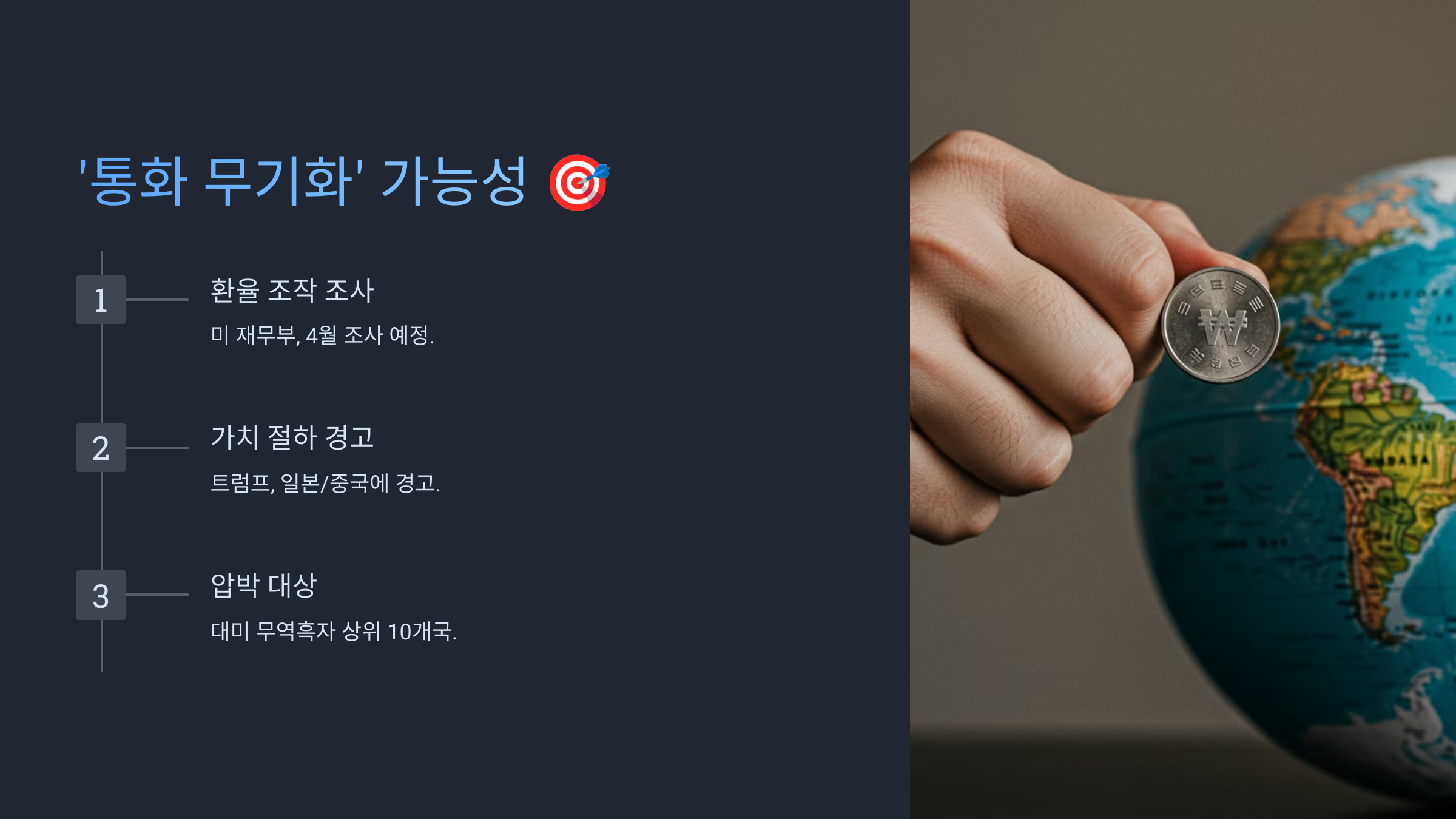 트럼프 행정부는 관세뿐만 아니라 달러화를 무기화할 가능성도 있습니다. 미 재무부는 4월까지 주요 교역국들의 환율 조작 여부를 조사할 예정이며, 트럼프는 이미 일본과 중국에 통화 가치 절하를 중단하라고 경고한 바 있습니다. 한국은 대미 무역흑자 상위 10개국에 포함되어 있어 이러한 압박의 대상이 될 가능성이 높습니다.