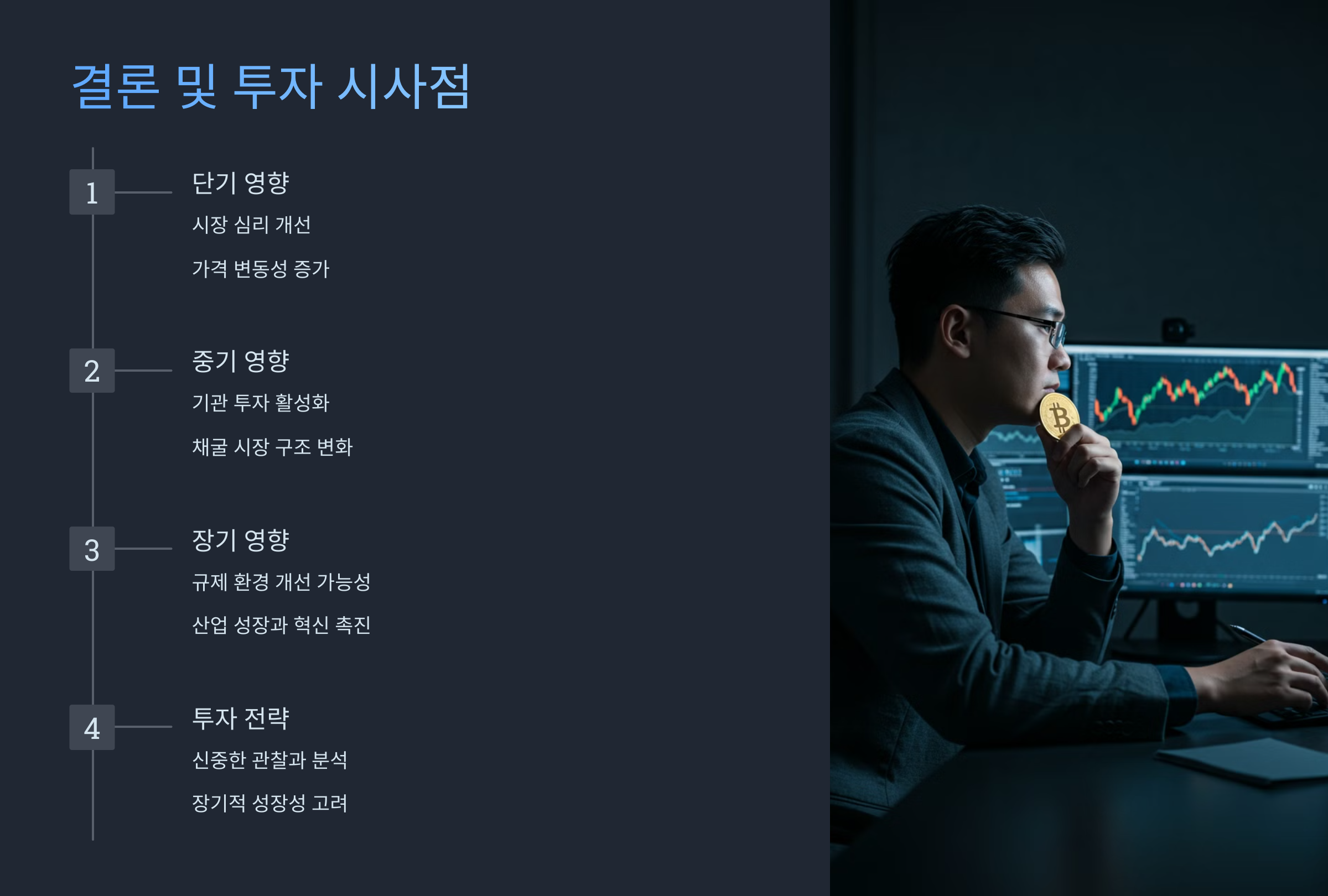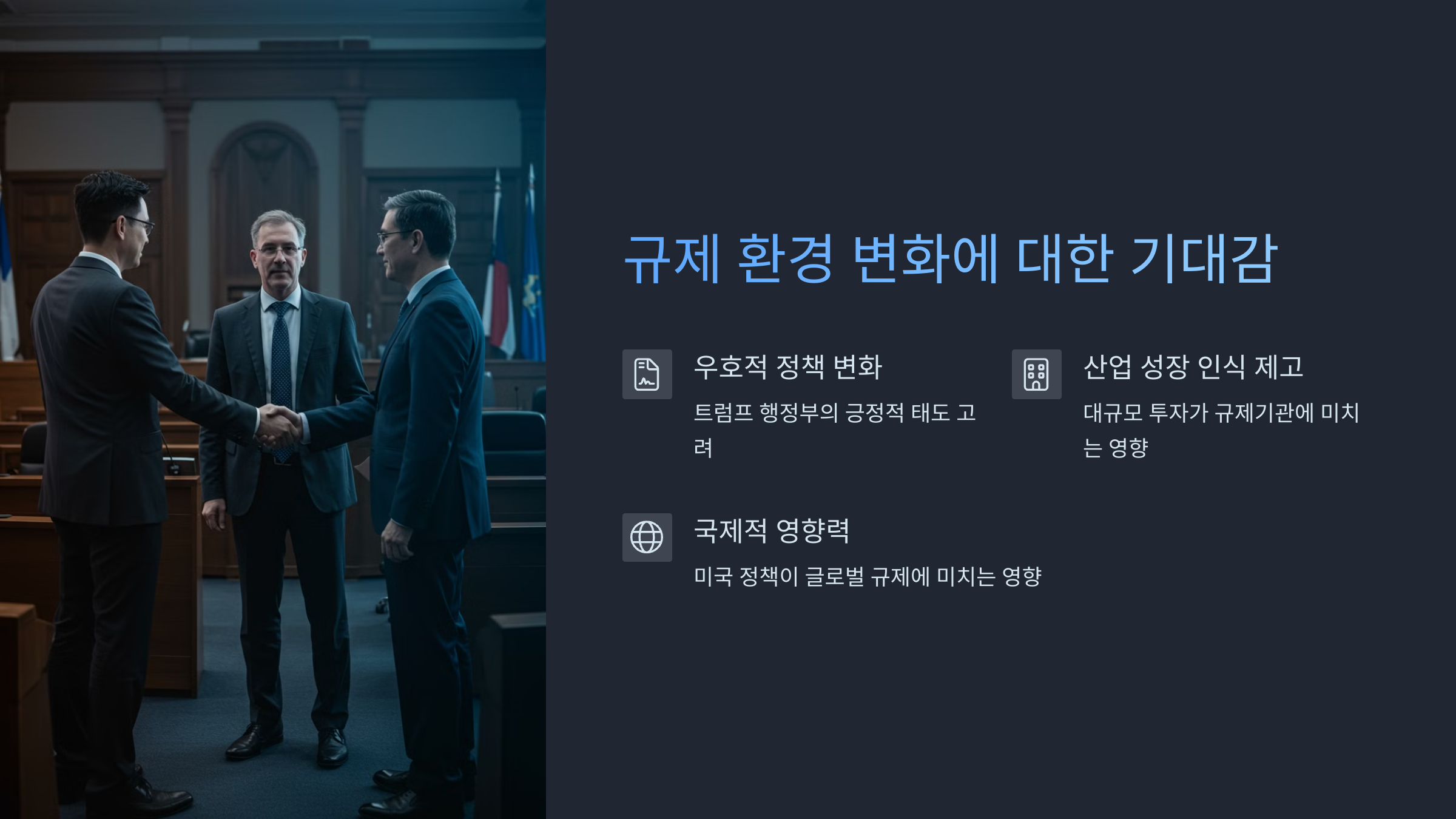 첫째, 우호적인 정책 변화 가능성입니다. 과거 트럼프 행정부의 암호화폐에 대한 다소 긍정적인 태도를 고려할 때, 이번 사업 진출은 관련 규제 완화나 우호적인 정책 변화에 대한 기대를 높일 수 있습니다.