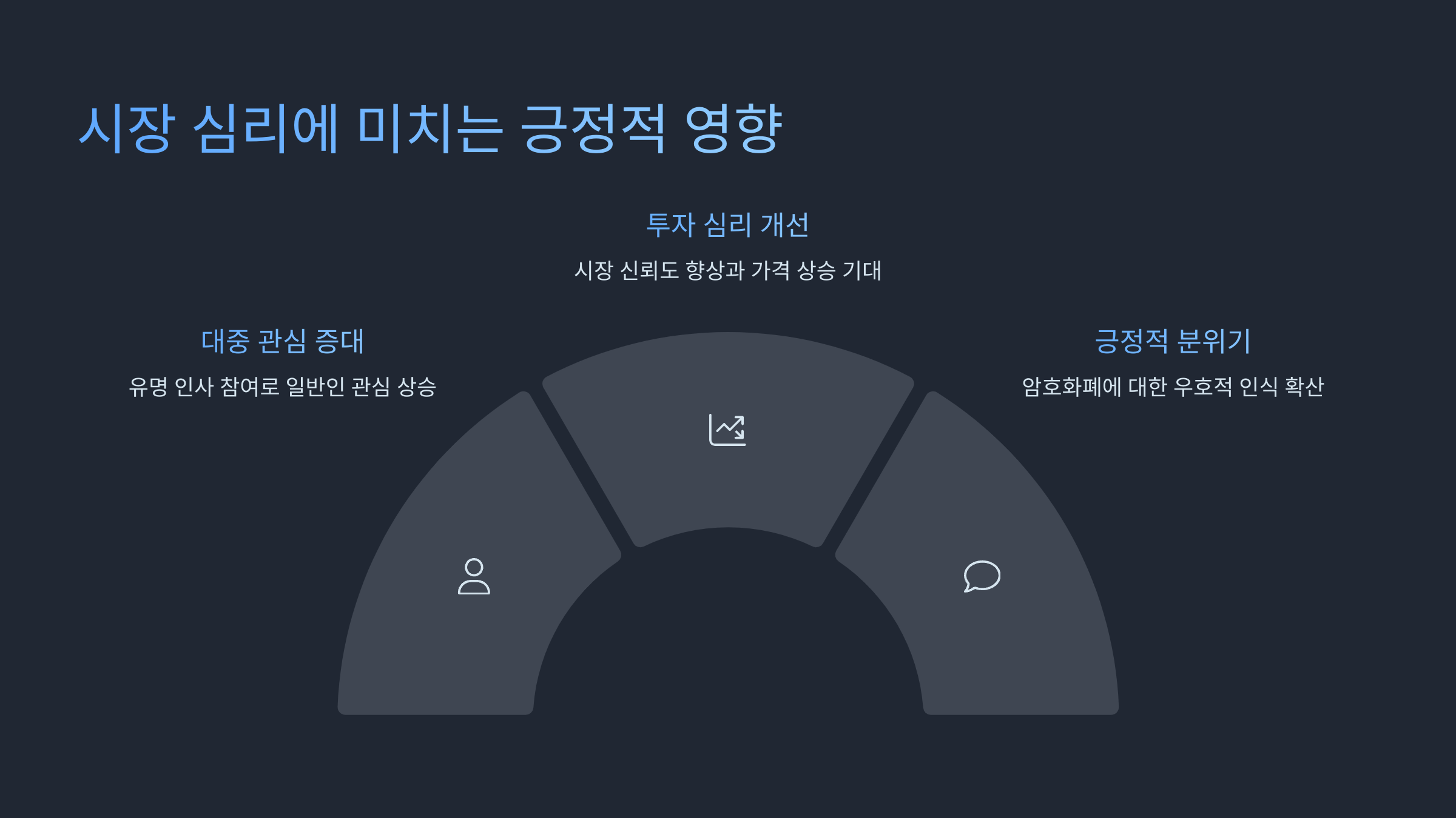 둘째, 투자 심리 개선입니다. 거물급 인사의 투자는 시장에 대한 신뢰도를 높이고, 전반적인 투자 심리를 개선하는 데 기여할 수 있습니다. 이는 단기적인 가격 상승을 이끌어낼 수도 있습니다.