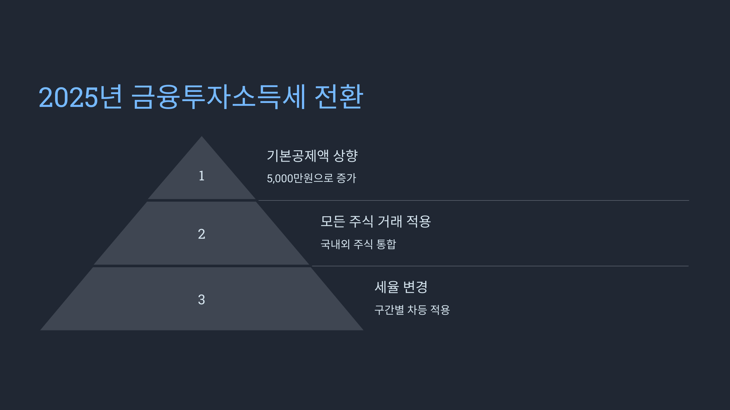 A5: 2025년부터는 모든 주식 거래에 금융투자소득세가 적용됩니다. 기본공제액이 5,000만원으로 상향되는 등 변경사항이 있으니 미리 확인하세요.