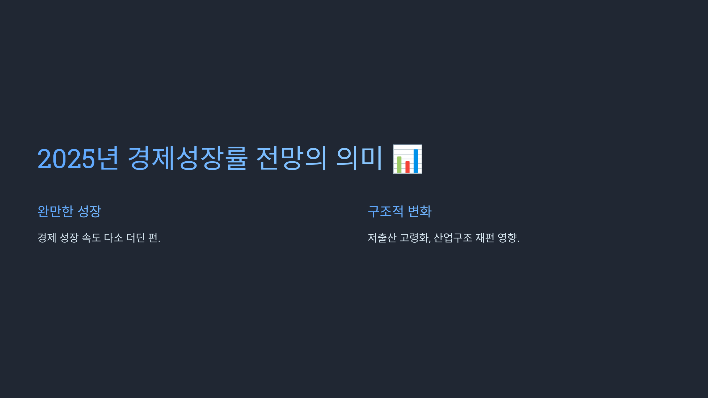 2025년 경제성장률이 1.5%로 예상된다는 것은 무엇을 의미할까요? 이는 경제가 완만하게 성장하고 있지만, 그 속도가 다소 더딘 편이라는 것을 나타냅니다. 지난 몇 년간 우리 경제가 겪어온 여러 도전들 - 코로나19 팬데믹의 여파, 글로벌 공급망 문제, 그리고 지정학적 불안정성 등 - 이 여전히 영향을 미치고 있다고 볼 수 있습니다.