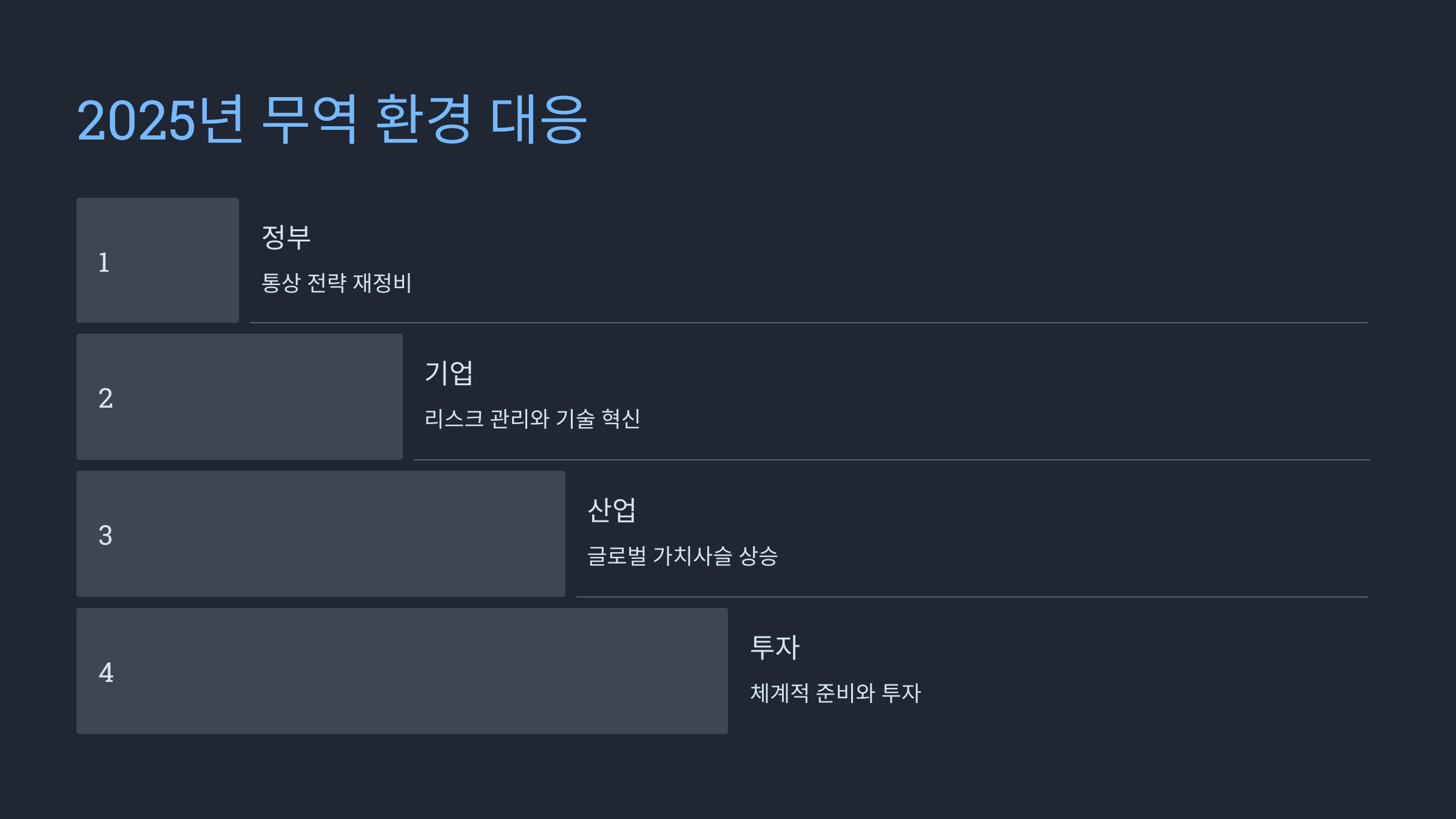 2025년을 앞둔 국제 무역 환경의 변화는 피할 수 없는 도전이자 기회입니다. 정부는 통상 전략을 재정비하고, 기업은 리스크 관리와 기술 혁신에 주력해야 합니다. 특히 디지털 전환과 친환경 정책 대응이 핵심 과제가 될 것입니다. 이러한 변화에 선제적으로 대응하여 새로운 기회를 창출하는 것이 무엇보다 중요합니다. 우리 기업과 산업이 글로벌 가치사슬에서 더 높은 위치를 차지하기 위해서는 지금부터 체계적인 준비와 투자가 필요한 시점입니다.