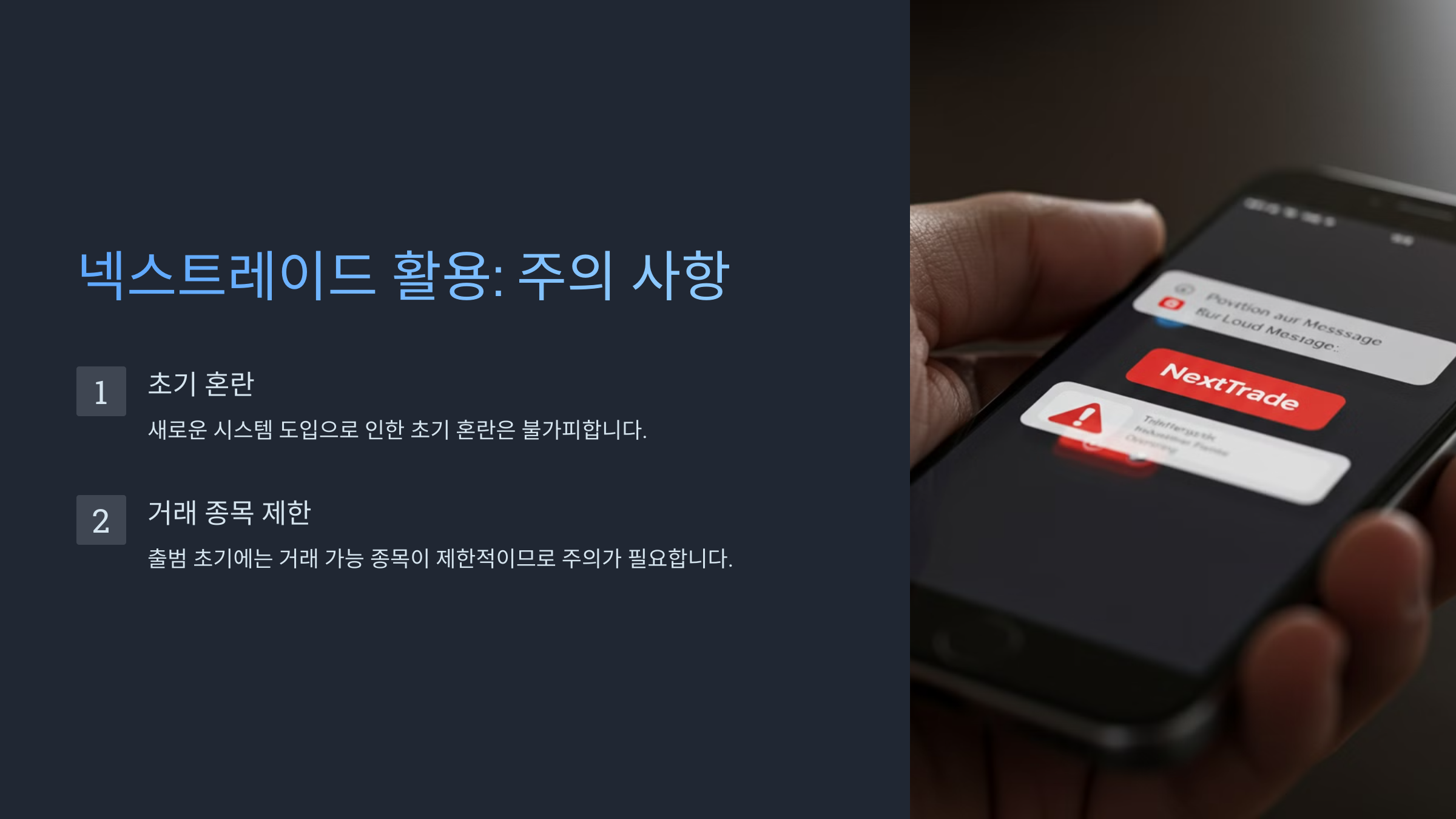 새로운 시스템 도입에 따른 혼란이 있을 수 있습니다. 특히 초기에는 거래 가능 종목이 제한적일 수 있으니 주의가 필요해요. 출범 첫날에는 10개 종목만 거래되며, 점진적으로 확대될 예정입니다.