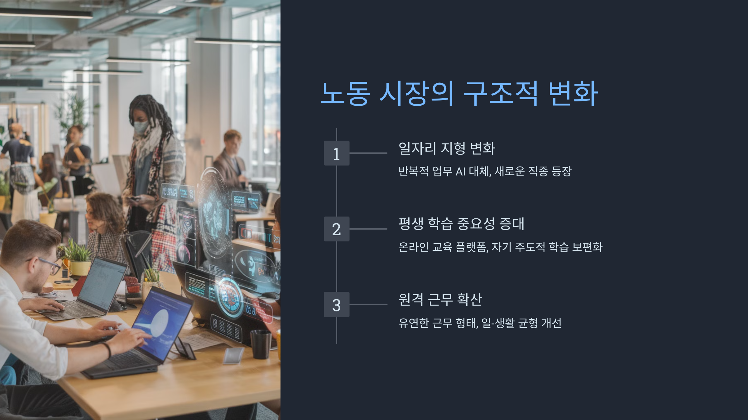 기술 변화의 속도가 빨라지면서 지속적인 학습과 역량 개발의 중요성이 커지고 있습니다. 온라인 교육 플랫폼을 통한 자기 주도적 학습이 보편화되고 있죠. - 원격 근무의 확산