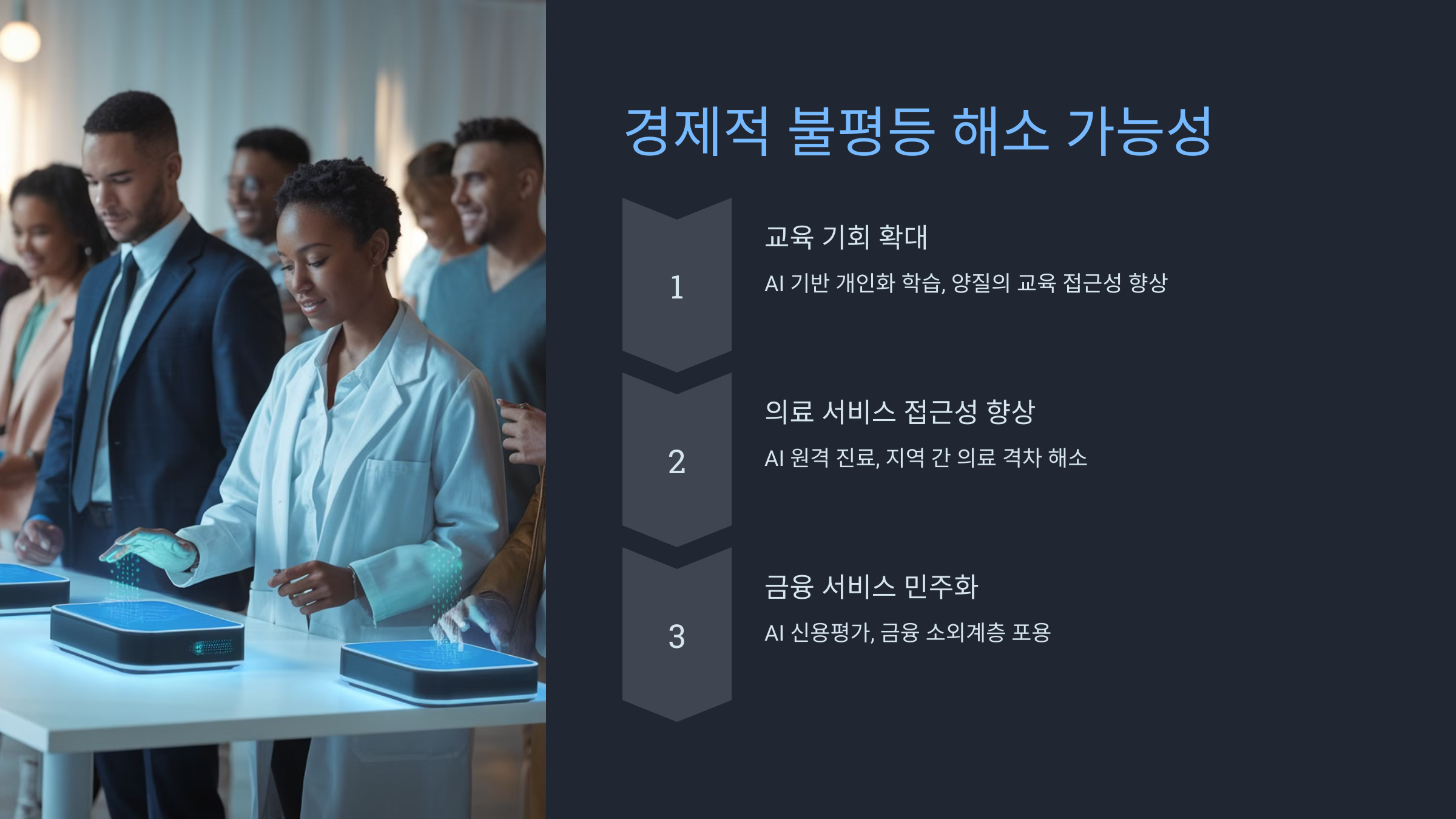 AI 기반의 개인화된 학습 시스템은 양질의 교육을 더 많은 사람들에게 제공할 수 있게 합니다. 이는 장기적으로 경제적 기회의 평등화로 이어질 수 있죠. - 의료 서비스 접근성 향상