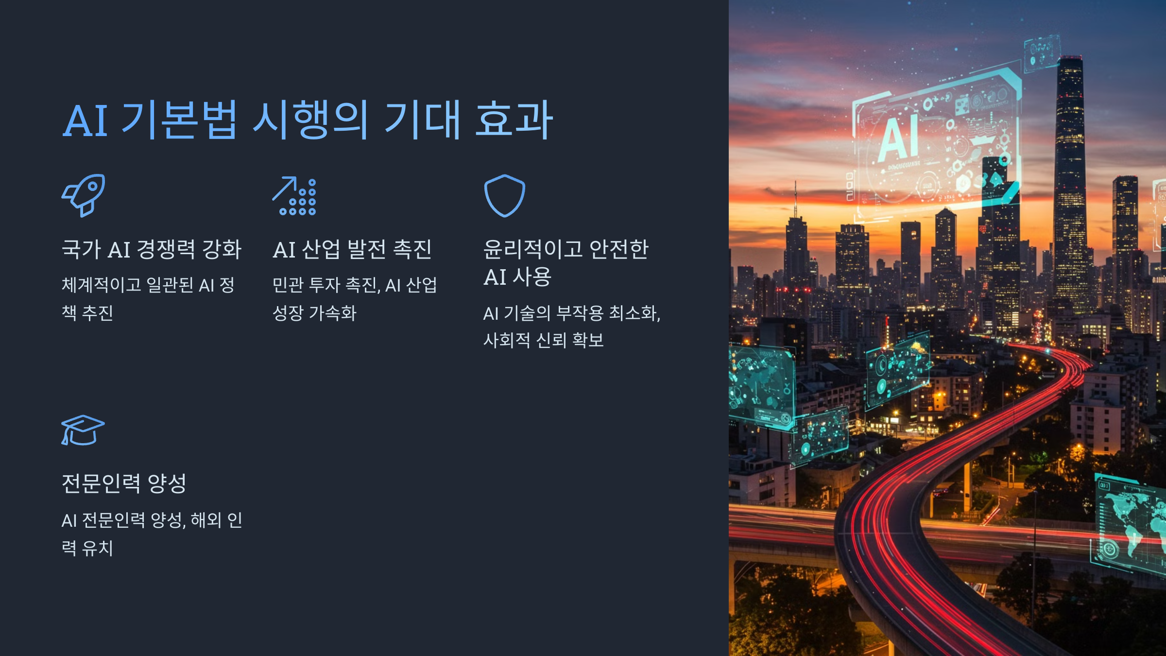 - 전문인력 양성: AI 관련 전문인력의 양성과 해외 전문인력 확보를 위한 정책적 지원이 가능해집니다.