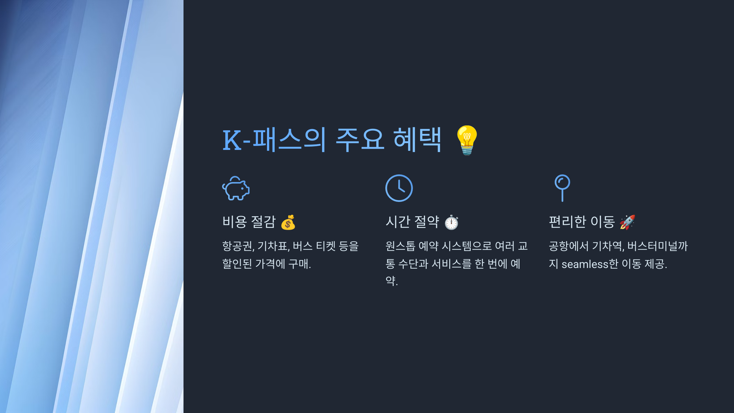 - 할인 혜택: K-패스를 통해 예약하면 항공권, 기차표, 버스 티켓 등을 할인된 가격에 구매 가능.