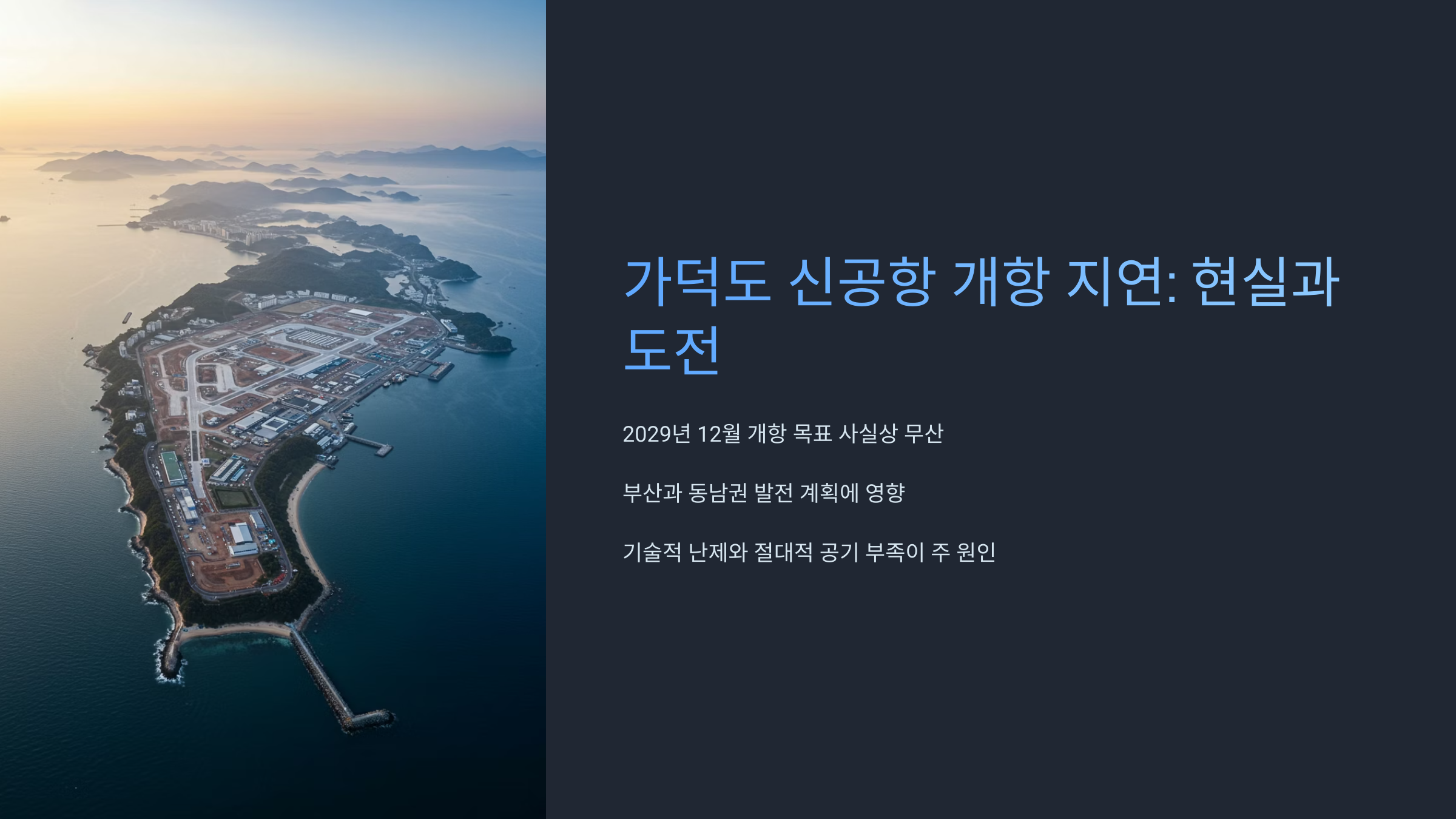 가덕도 신공항, 2029년 개항 사실상 무산부산의 오랜 염원, 하지만 현실의 벽은 높았나 봅니다...안녕하세요, 부산 시민 여러분 그리고 가덕도 신공항 소식을 기다려오신 모든 분들!오늘은 2025년 4월 29일, 우리 지역의 미래와 직결된가덕도 신공항 건설과 관련하여 안타까운 소식을 전하게 되어 마음이 무겁습니다.많은 분들이 2030 부산 세계박람회 유치를 위해, 그리고 동남권 관문 공항의 꿈을 안고2029년 12월 개항 목표를 향해 달려가는 가덕도 신공항을 응원하셨을 텐데요.최근 여러 상황을 종합해 볼 때, 현실적으로 2029년 개항은 어렵게 되었다는 분석이 지배적입니다.정말 아쉬운 소식이지만, 왜 이런 이야기가 나오는지,앞으로의 전망은 어떠한지 함께 차분히 짚어보는 시간을 갖도록 하겠습니다.오늘 이야..
