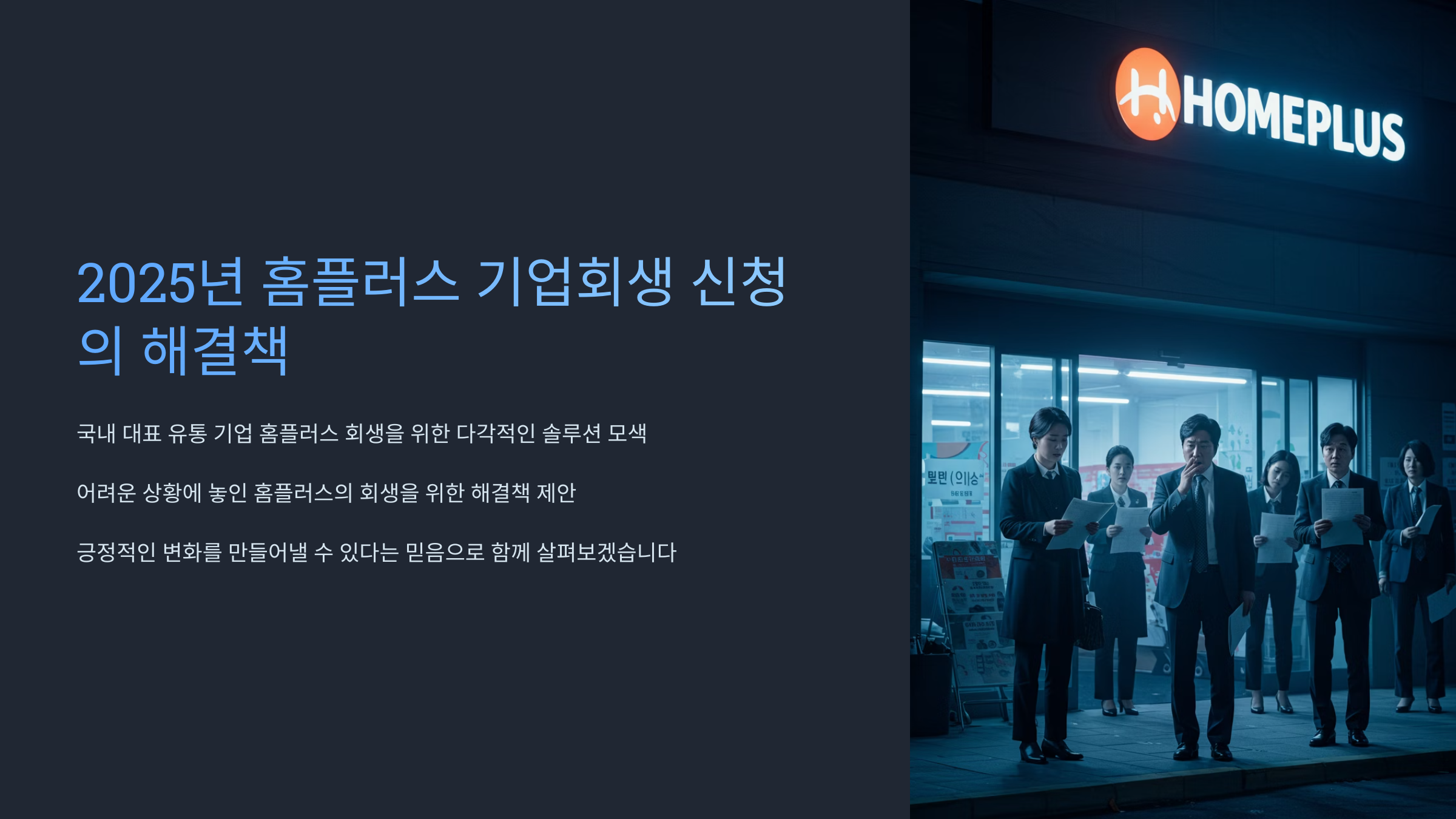 2025년 홈플러스 기업회생 신청의 해결책국내 대표 유통 기업, 홈플러스의 회생을 위한 다각적인 솔루션 모색안녕하세요 여러분! 오늘은 안타깝게도 2025년 기업회생 신청이라는 어려운 상황에 놓인 홈플러스의 회생을 위한 해결책을 함께 고민해보는 시간을 갖겠습니다.오랜 시간 동안 우리 곁을 지켜온 홈플러스가 다시 한번 성장 동력을 찾고 고객들에게 사랑받는 기업으로 거듭날 수 있도록 다양한 관점에서 해결 방안을 제시해보고자 합니다.어려운 시기이지만, 긍정적인 변화를 만들어낼 수 있다는 믿음을 가지고 함께 살펴보시죠! 목차재무 구조 정상화를 위한 긴급 처방 💰경영 효율성 극대화를 위한 혁신 전략 ⚙️변화하는 시장 경쟁력 확보 방안 📈이해관계자 협력을 통한 신뢰 회복 🤝미래 성장을 위한 새로운 동력 발굴 ?..