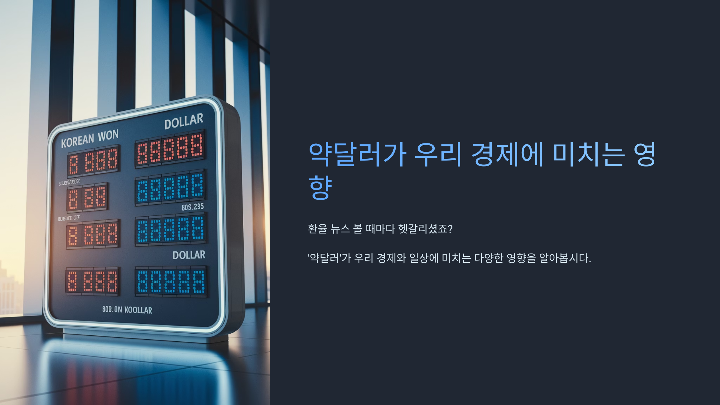 약달러가 우리 경제에 미치는 영향환율 뉴스 볼 때마다 헷갈리셨죠? '약달러'가 대체 우리에게 어떤 의미일까요?안녕하세요 여러분!뉴스를 보다 보면 '원/달러 환율 하락', '약달러 추세' 같은 이야기 심심치 않게 들리시죠?숫자가 오르내리는 건 알겠는데, 그래서 그게 우리 경제나 내 생활에 무슨 영향을 미치는 건지 헷갈리실 수 있어요.특히 '약달러'라는 말이 나오면,달러가 약해지는 게 왜 우리한테 중요할까?좋은 걸까, 나쁜 걸까 궁금해지실 텐데요.오늘은 이 '약달러' 현상이 우리 경제에 어떤 영향을 미치는지,장점은 무엇이고 단점은 무엇인지 함께 쉽고 자세하게 알아보려고 합니다.알고 보면 우리 생활과도 밀접한 환율 이야기,지금 바로 시작해볼까요?목차약달러, 정확히 무슨 뜻일까요? 🤔약달러가 우리 경제에 주는..